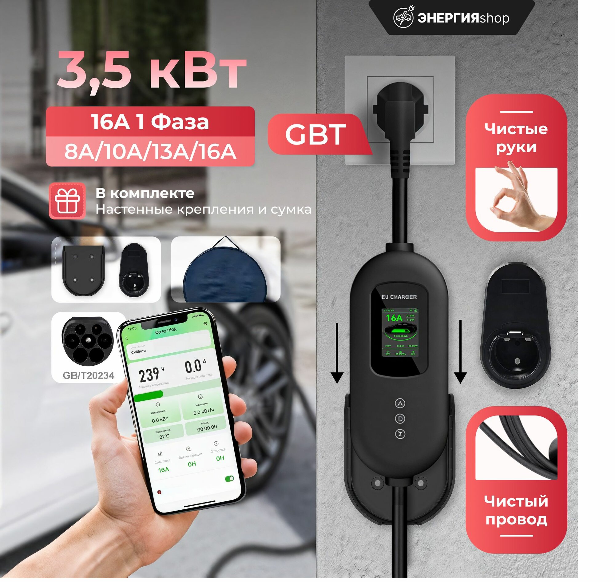 Портативная зарядная станция для электромобиля GBT 8-16А 220В 3,5 кВт IP66 с сумкой: сравнение цен, характеристики, фото, актуальное наличие и цены.