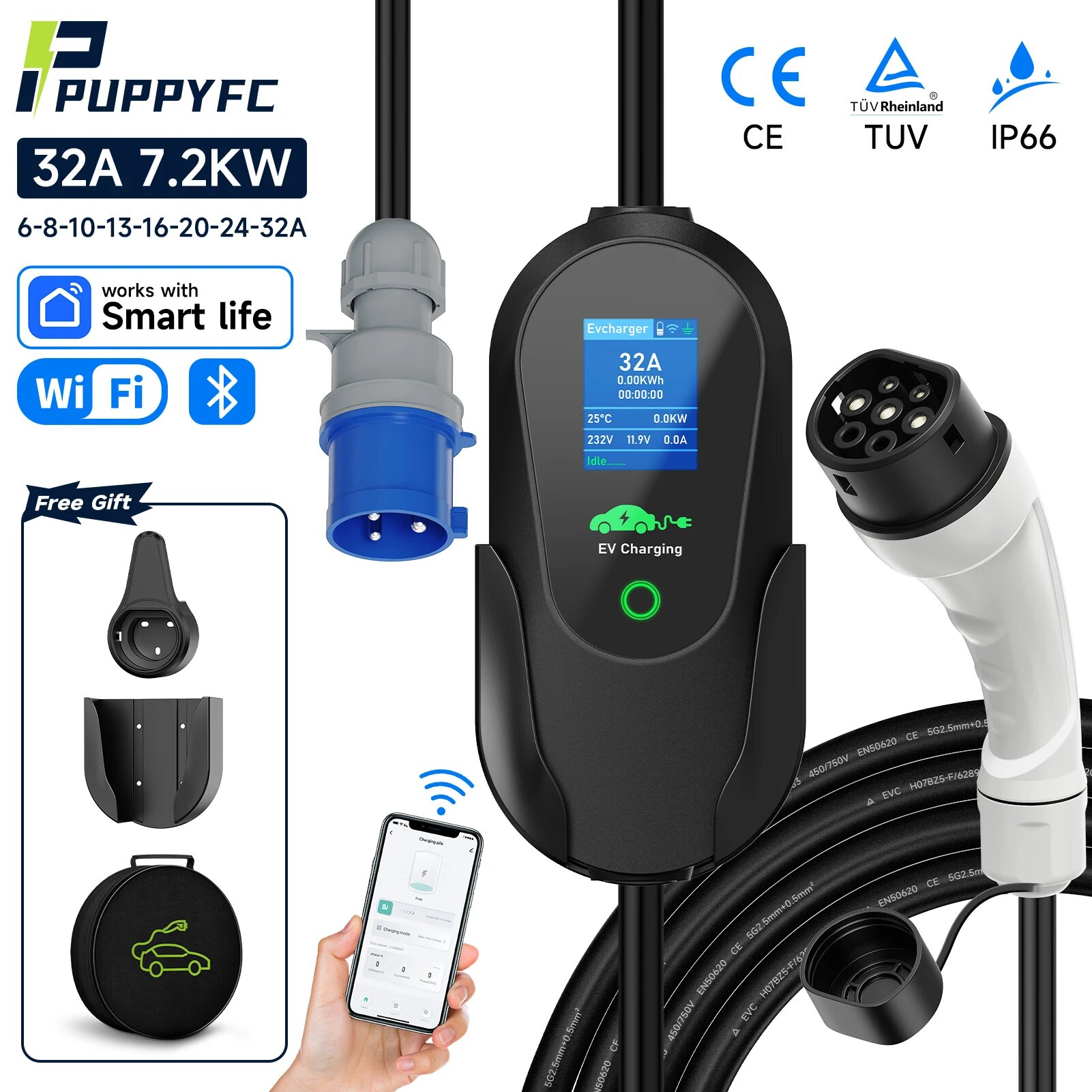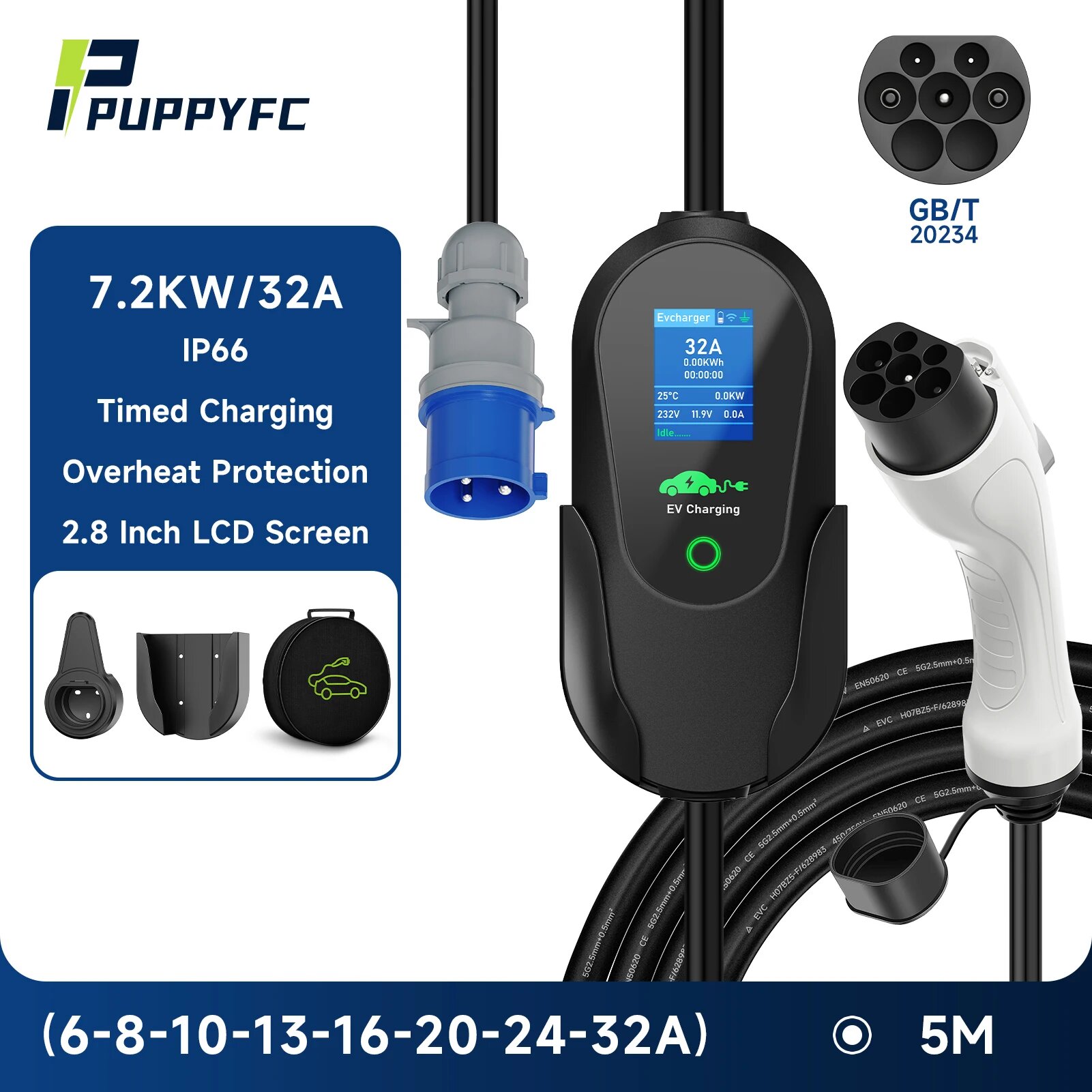Купить Портативное зарядное устройство для электромобилей Puppyfc, 7,2 кВт, 32 А, тип 2/кабель для быстрой зарядки, IP66, защита от перегрузки, управление Wi-Fi для электромобиля, GBT 7.2KW 5M с доставкой по всей России.