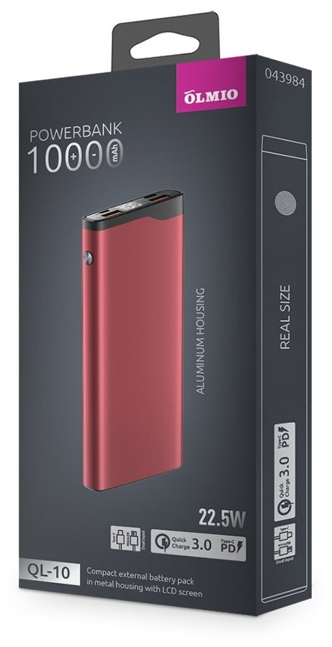 Портативное зарядное устройство Olmio QL-10 10000mAh, 22,5W, QC 3.0, PowerDelivery, красный: сравнение цен, характеристики, фото, актуальное наличие и цены.