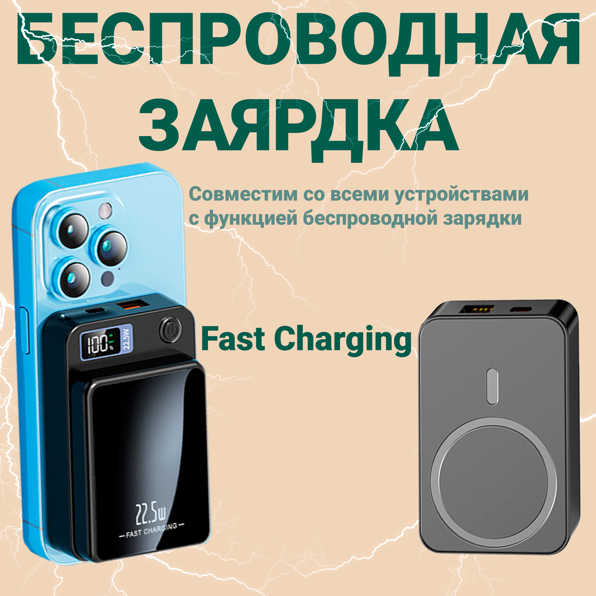 Купить Портативный аккумулятор 10000 mAh, Fast Charging с магнитной беспроводной зарядкой Magsafe для iPhone и Android, Черный с доставкой по всей России.