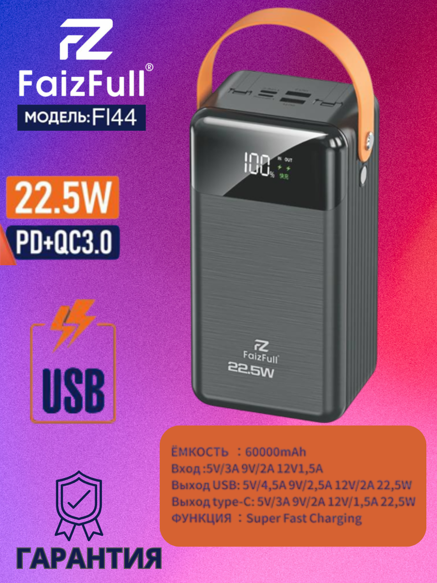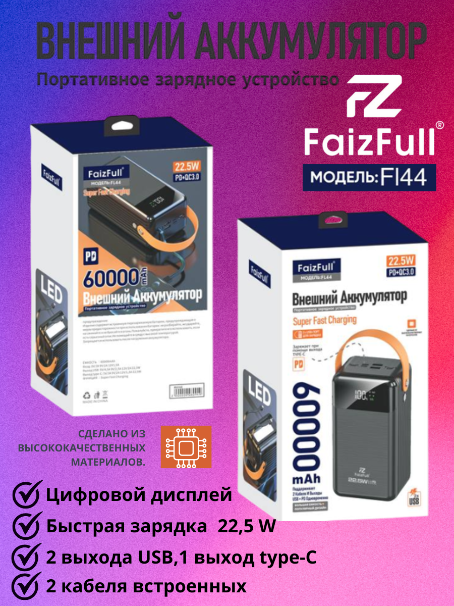Портативный аккумулятор FaizFull FL44 60000 мА/ч, для смартфонов, с фонариком, встроенные провода, черный: сравнение цен, характеристики, фото, актуальное наличие и цены.