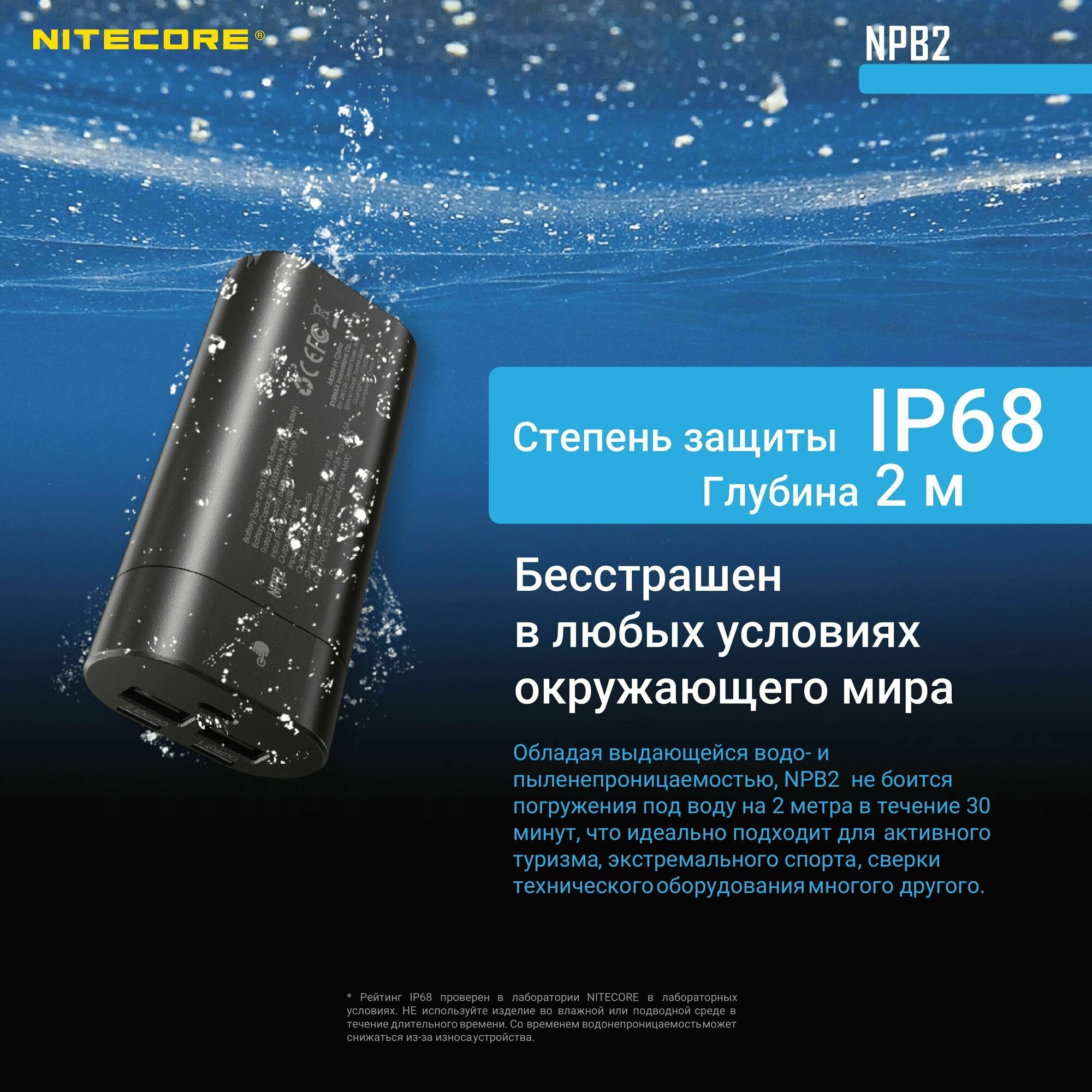Благодаря водонепроницаемости по стандарту IP68, зарядное устройство Nitecore NPB2 обретает отменную защиту предотвращающую повреждение комплектующих от влаги и пыли.