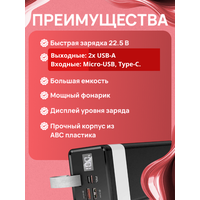 • Мощность 60000 mAh – идеальный выбор для долгих поездок и активного использования гаджетов. • Одновременная зарядка 3 устройств – поддержка всех популярных стандартов быстрой зарядки. • Технология Smart ID – защита устройств, оптимизация подачи тока. • Дисплей с индикатором уровня заряда – всегда знайте, сколько энергии осталось. • Встроенный фонарь – до 96 часов работы, удобен в темное время суток. • Ремешок для переноски – комфорт в дороге и путешествиях. • Совместимость с Power Delivery, Quick Charge 3.0, AFC, SCP, FCP – подходит для большинства гаджетов.