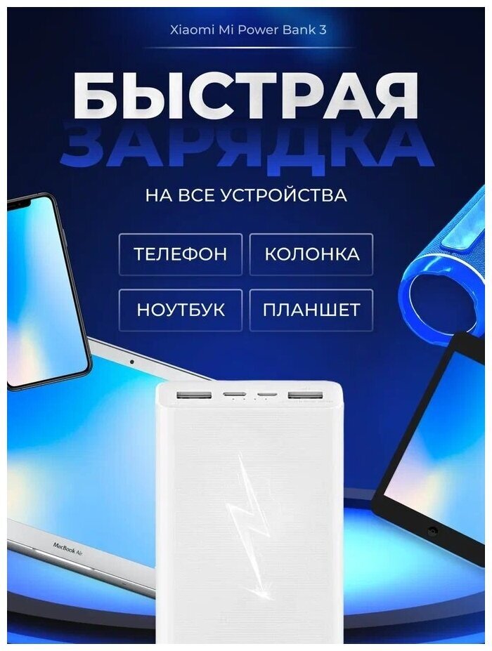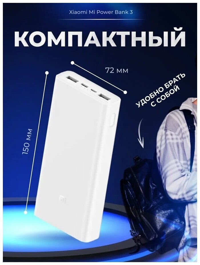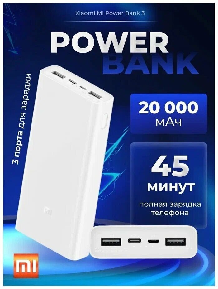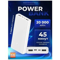 Xiaomi Mi Power Bank 3 20000mAh (PLM18ZM) – отличается стильным дизайном, высокой емкостью батареи и возможностью подключения нескольких устройств. Одной из примечательных особенностей портативного девайса является наличие 4 портов, один из которых порт USB Type-C. Данный порт поддерживает двустороннюю быструю зарядку с максимальной выходной мощностью 18 Вт. Для зарядки аккумулятора даже из двух портовСам внешний аккумулятор можно зарядить через порт USB-C или Micro-USB, при использовании только одного порта максимальная входная мощность может достичь 18 Вт. Через порт USB-C такой же мощностью можно зарядить как сам аккумулятор, так и подключенное устройство, эффективно снижая время ожидания зарядки. Универсальная батарея PLM18ZM оборудована тремя выходными интерфейсами, включая 2 порта USB-A и 1 порт USB-C, что позволит вам заряжать до трех устройств одновременно. Оба порта USB-A способны обеспечить выход 5В-2.4А, 9В-2А, 12В-1.5А. Интерфейс USB-C поддерживает двухстороннюю быструю зарядку 18 Вт (максимум). Заряжает устройства Apple на 50% быстрееС помощью кабеля USB-C - Lightning можно зарядить iPhone 11 на 50% быстрее, чем стандартным оригинальным зарядным устройством мощностью 5 Вт. Светодиодные индикаторы, находящиеся рядом с разъемами, показывают текущий уровень заряда. Одновременная зарядка трех устройств. Быстрее и эффективнееОт двух портов USB-A и одного USB-C можно одновременно заряжать три разных устройства. При использовании одного порта максимальная выходная мощность составляет впечатляющие 18 Вт, что превосходит многие сетевые устройства, обеспечивая быструю зарядку. Зарядит смартфоны, планшеты, консоли и не толькоВстроенный во внешний аккумулятор Xiaomi умный чип распознает подключенное устройство и определяет наиболее подходящую мощность для его зарядки, будь то смартфон, планшет, игровая консоль или даже самодельный проект - ни одно устройство не останется без заряда. Поддержка носимых устройствДважды нажав на кнопку проверки заряда, можно на 2 часа включить режим зарядки малым током для умных браслетов и гарнитур, не оставляя их без энергии. Чистый и неустаревающий белый цветКорпус внешнего аккумулятора Xiaomi выполнен из экологичного поликарбоната и АБС-пластика и имеет матовую поверхность с тонким тактильным рисунком, дополняющим общий образ яркой чертой. Кроме того, благодаря такому покрытию аккумулятор прочно лежит в руке или на столе, а также не боится царапин. Высококачественная плата защиты и управленияПередовая плата управления питанием обеспечивает не только высокую степень безопасности, но и повышает эффективность передачи энергии и устойчивость напряжения. Многоступенчатая защита даст возможность спокойного использования, исключая повреждение подключенного устройства и самого аккумулятора. Главные характеристикимодель PLM18ZMПроизводитель XiaomiРазмеры 150.6 х 72.2 х 26.3 ммСтрана производитель КитайВес (g) 440Материал ПластикЦвет белыйобщие характеристикимаксимальная мощность 18 WОдновременная зарядка двух устройств ЕстьМаксимальный ток 3.6 AПараметры (выход) USB-A(1): 5.1V/2.4A, 9V/2A, 12V/1.5A; USB-A(2):5V/3.6A; USB-C: 5V/3A, 9V/2A, 12V/1.5AРазъемы (выход) 2x USB-A, 1x usb-cаккумулятор И питаниеподдержка быстрой зарядки Есть, QC 3.0Объем аккумулятора 20000 mAhФактическая емкость 12000 mAhВремя зарядки 6.5 ч (18 Вт); 11 ч (10 Вт)Индикатор заряда ЕстьПараметры (вход) Micro-USB: 5V/3A, 9V/2A, 12V/1.5A; USB-C: 5V/2A, 9V/2A, 12V/1.5AРазъем (вход) 1x Micro-USB, 1x US