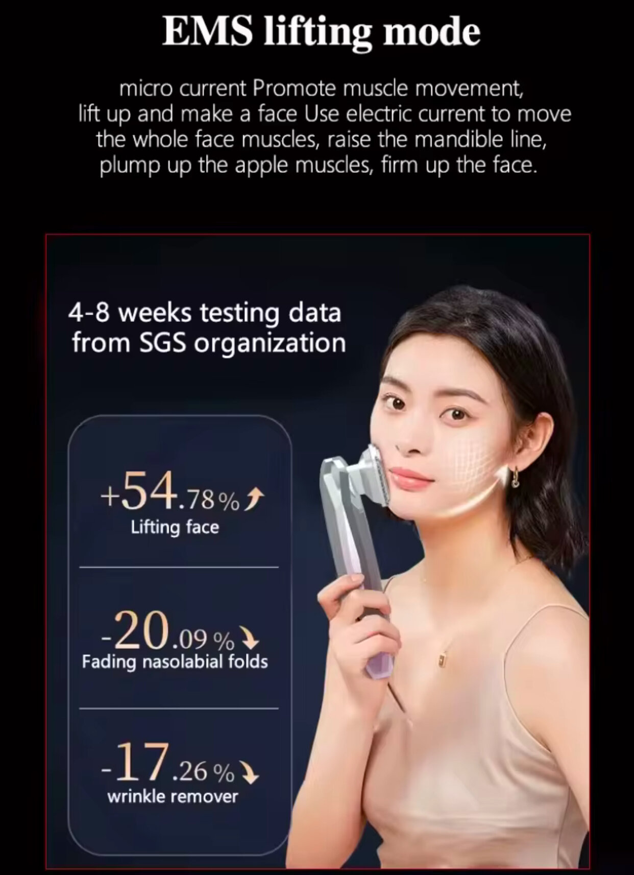 EMS-стимуляция: EMS-стимуляция стимулирует мышцы лица, улучшая их тонус и упругость, что способствует разглаживанию морщин и общему улучшению внешнего вида кожи.