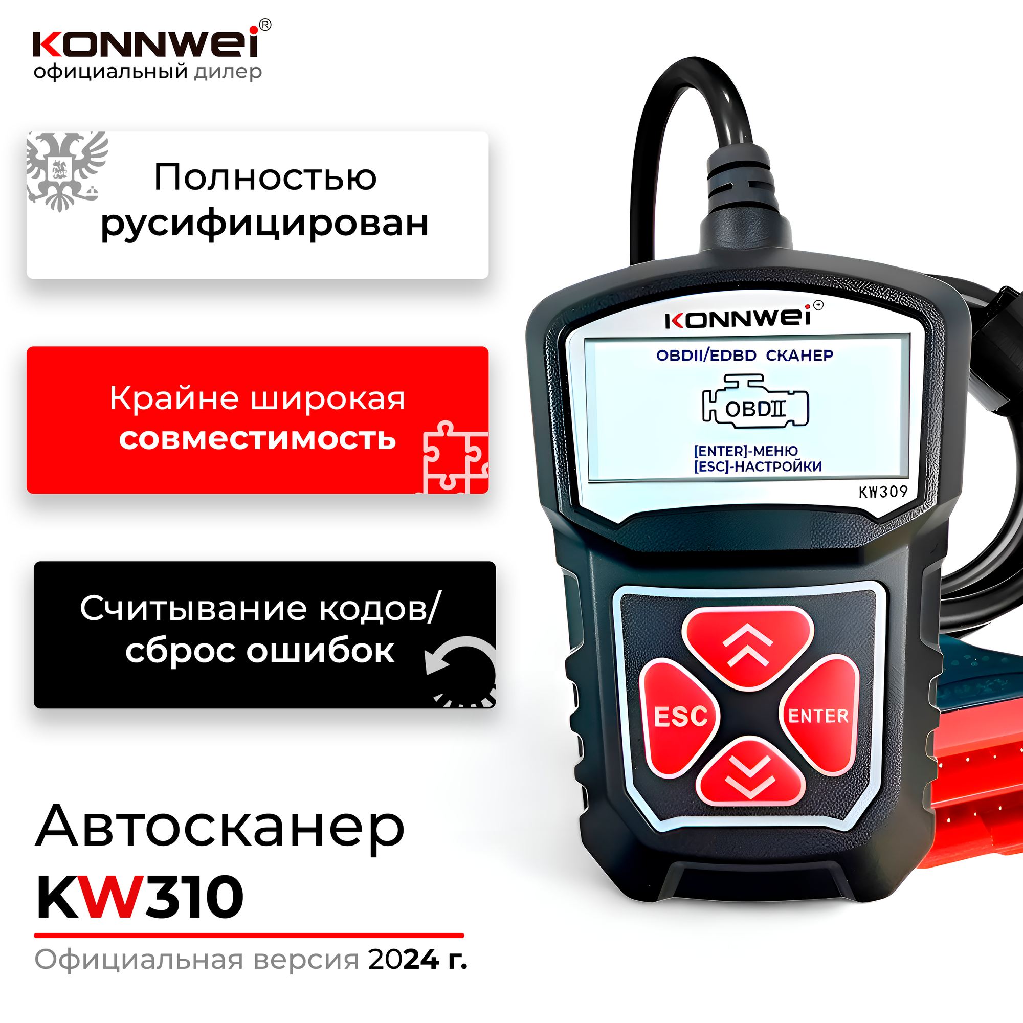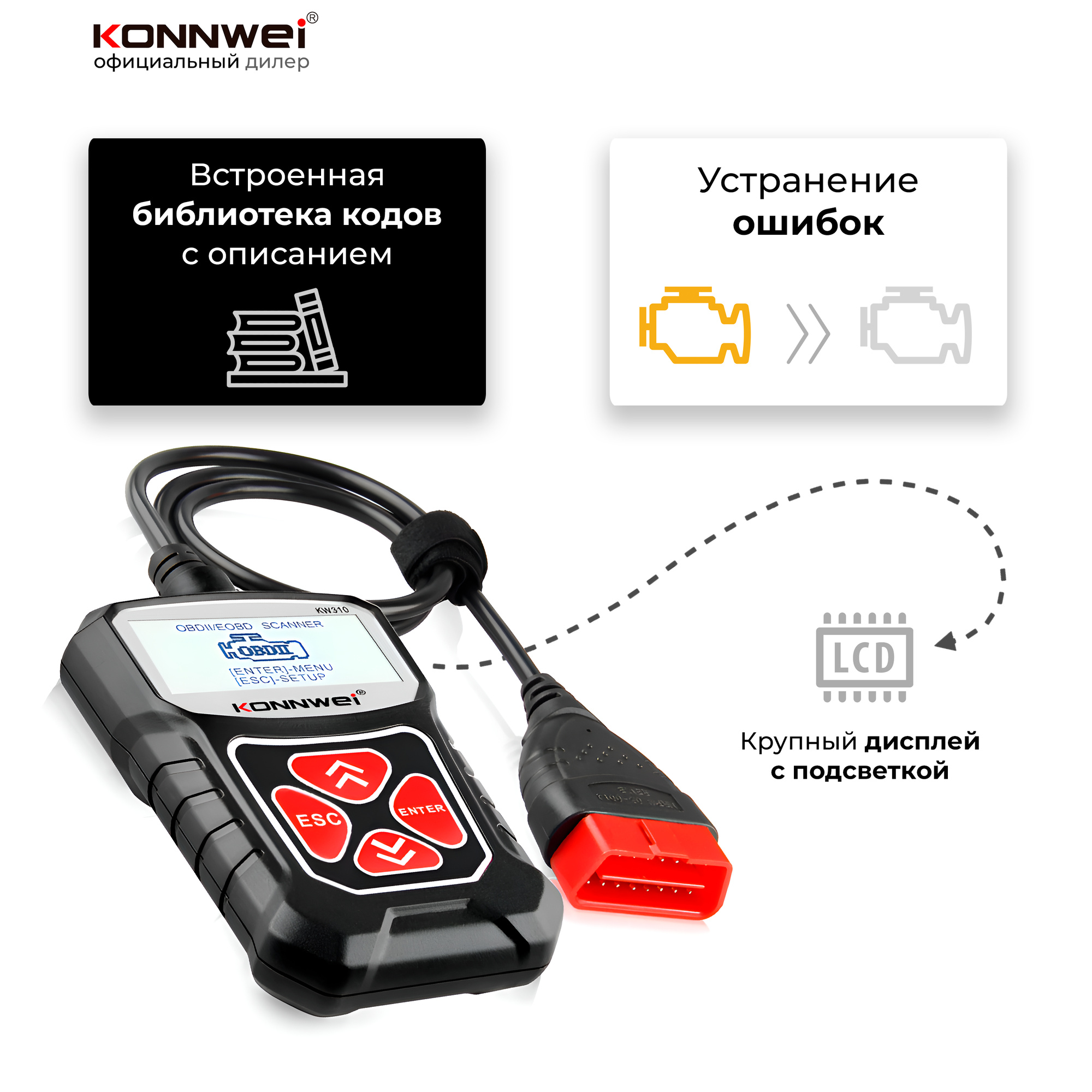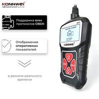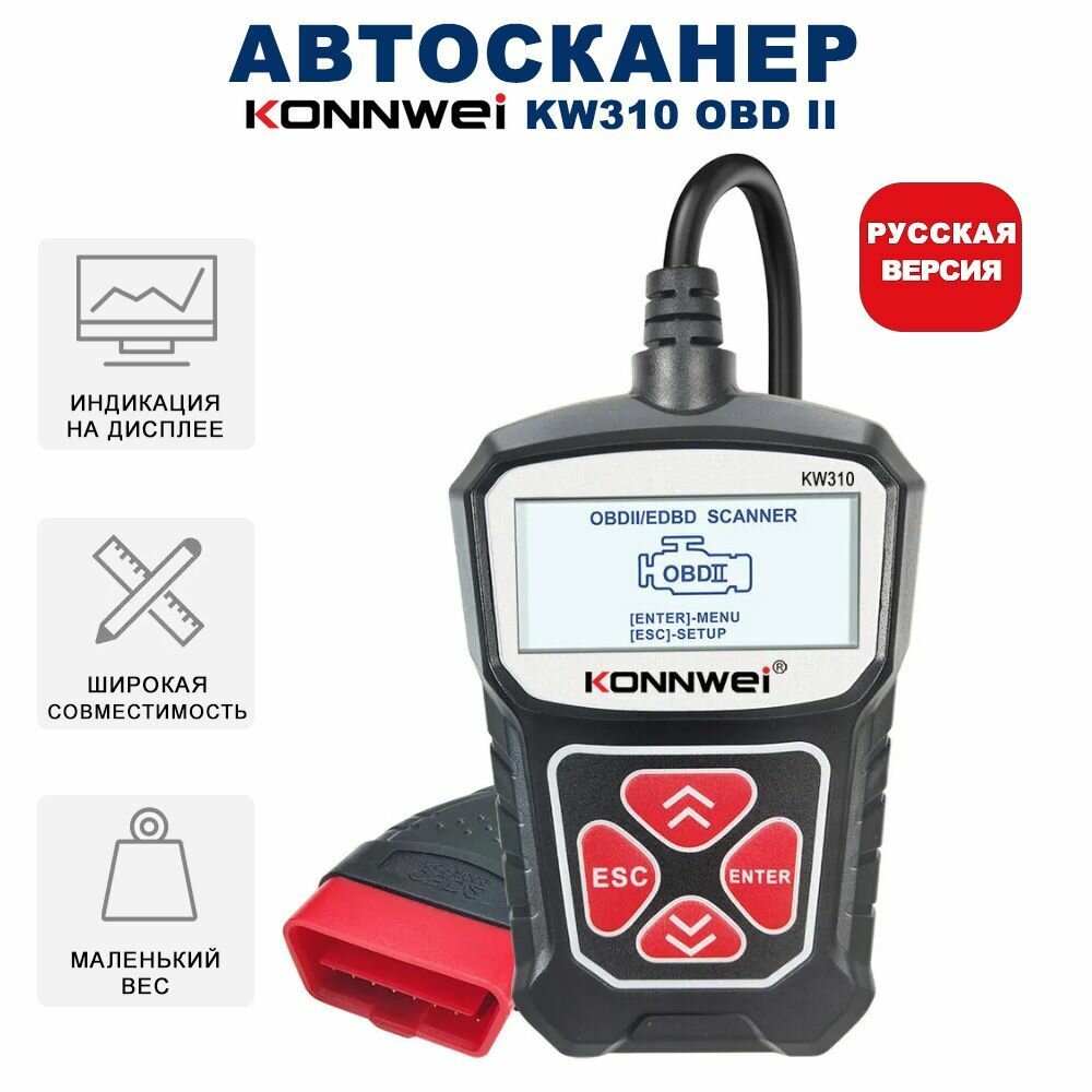 Konnwei KW310 – устройство для диагностики автомобиля подключается к разъему OBD2 и позволяет самостоятельно считывать и сбрасывать коды неисправностей, проверять работу различных систем. Автосканер оснащен крупным дисплеем с подсветкой, поддерживает построение графиков в реальном времени, меню переведено на русский язык. В прошивке автосканера встроена библиотека кодов неисправностей с описаниями.