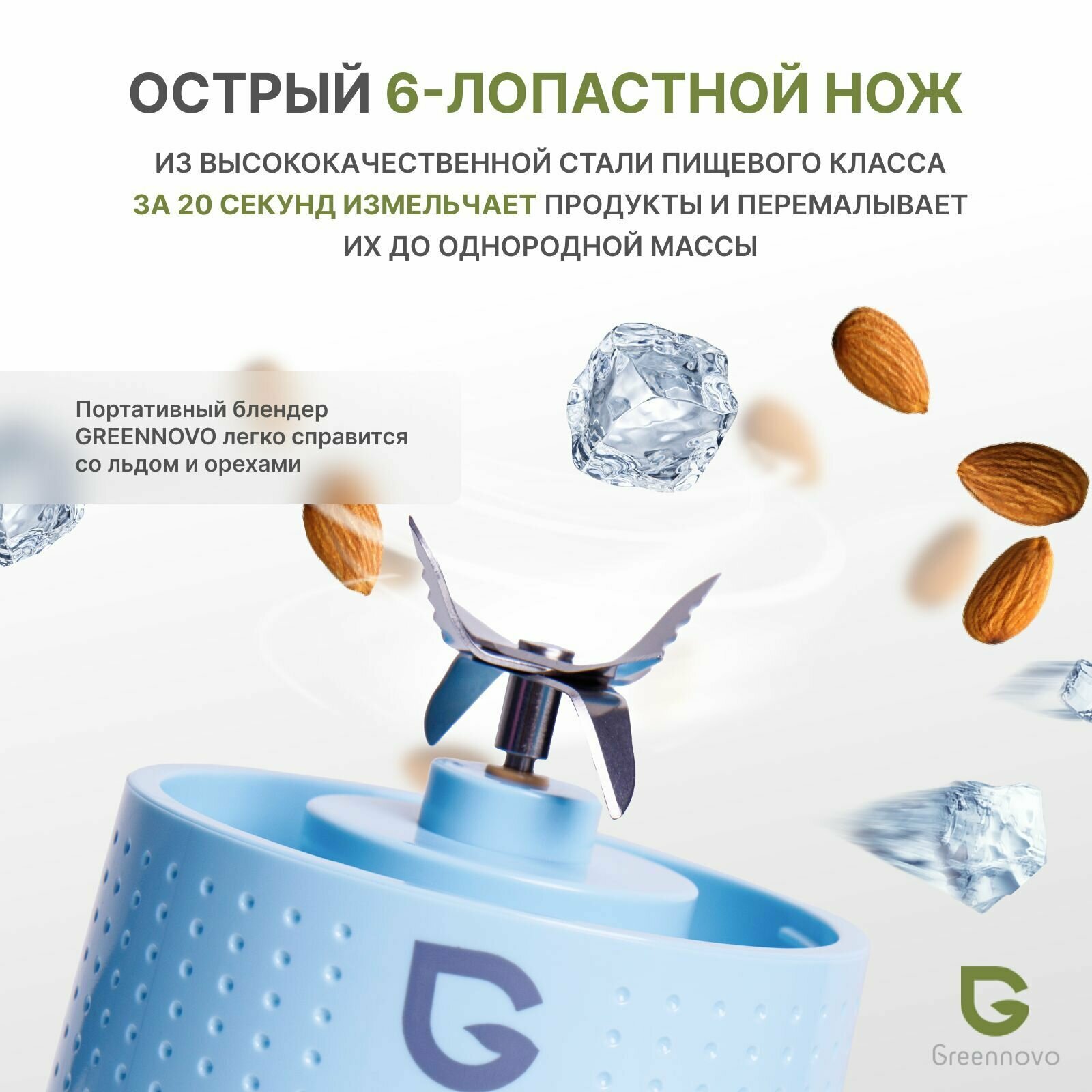 Многофункциональность Greennovo позволит вам воплотить как классические, так и самые дерзкие идеи. Порадуйте деток смузи из свежей клубники, удивите мужа супом-пюре, позаботьтесь о себе и создайте натуральные крема, маски, пилинги. С помощью этого портативного блендера можно перемолоть кофе, лёд, сделать овсяную муку, сахарную пудру, взбить молочный коктейль. Так как блендер имеет 6 ножей, он не просто смешает мягкие ингредиенты, но и измельчит твердые продукты, гарантированно доведет блюдо до нужной консистенции. Greennovo станет частью вашей жизни, верным помощником в достижении спортивных целей и создании домашнего уюта.