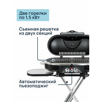 Газовый гриль MIKU — удобное решение для отдыха на природе. Благодаря мощности 3 кВт (две горелки по 1,5 кВт) он быстро разогревается и обеспечивает равномерное приготовление мяса, рыбы и овощей. Автоматический пьезоподжиг позволяет легко разжечь гриль одним нажатием. Плавная регулировка пламени дает возможность точно контролировать температуру приготовления. Гриль оснащен крышкой со встроенным термометром: вы сможете следить за процессом, не открывая гриль, и готовить в любую погоду.