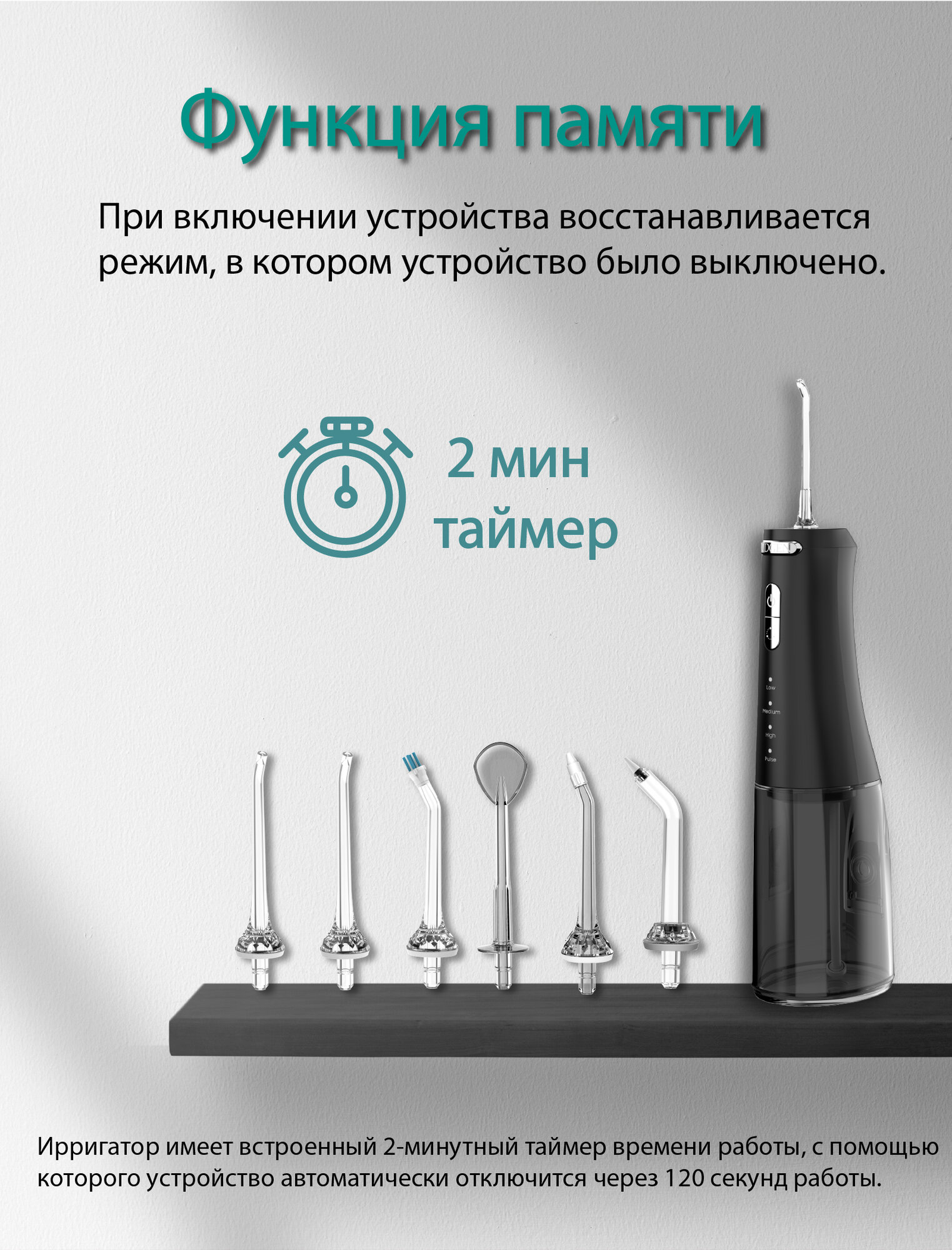 У ирригатора 4 режима очистки (High, Medium, Low, Pulse) для ухода за зубами и деснами, чтобы выбирать режим, который лучше всего подходит для здоровья вашей полости рта. С помощью встроенного таймера времени работы на 2 минуты, ирригатор автоматически выключается при работе в любом режиме через 120 секунд, а функция памяти ирригатора сохраняет и восстанавливает прежний режим работы, на котором прибор был отключен. Небольшой размер, легкий вес, удобный дизайн портативного ирригатора RIDGEN RD-350 и дорожный чехол обеспечивающий безопасное хранение и транспортировку, позволяют комфортно брать ирригатор с собой в поездку.