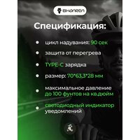 Особенности: • Время работы: 4 минуты • Цикл надувания: 90 секунд • Максимальное давление: до 100 фунтов на кв. дюйм • Автоматическая защита от перегрева • USB Type-C • Размер насоса: 70 мм x 63,3 мм x 28 мм • Вес: 98 г