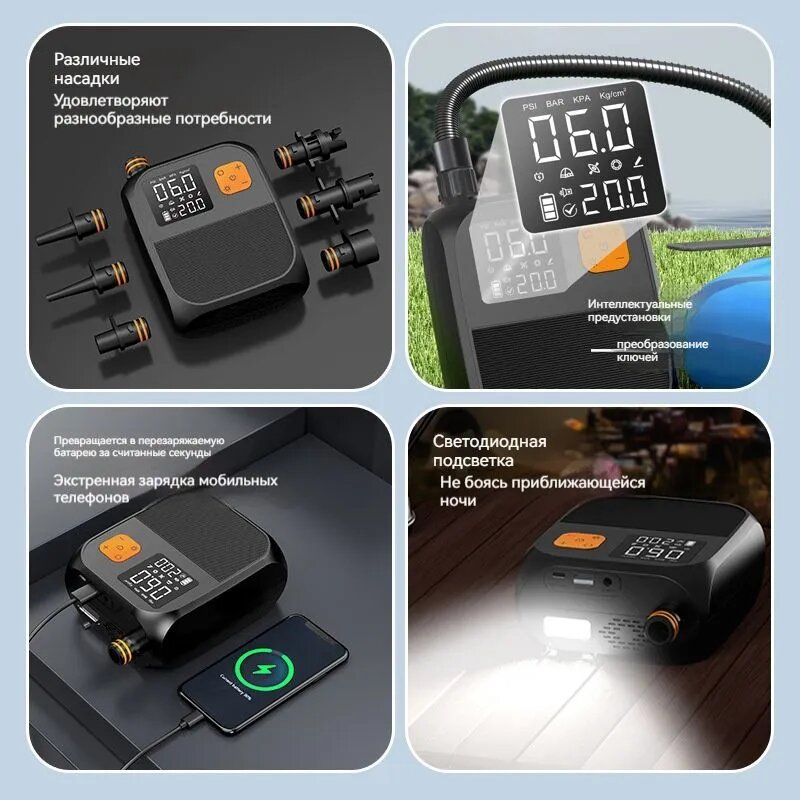 Многофункциональность и готовность к экстренным ситуациям: помимо того, что он является надежным надувным насосом, он оснащен функцией выхода USB, что позволяет ему служить в качестве аккумулятора для экстренной зарядки телефона. Кроме того, он оснащен светодиодной подсветкой в трех режимах (белый свет, красный свет и SOS) для дополнительного удобства и безопасности во время активного отдыха.