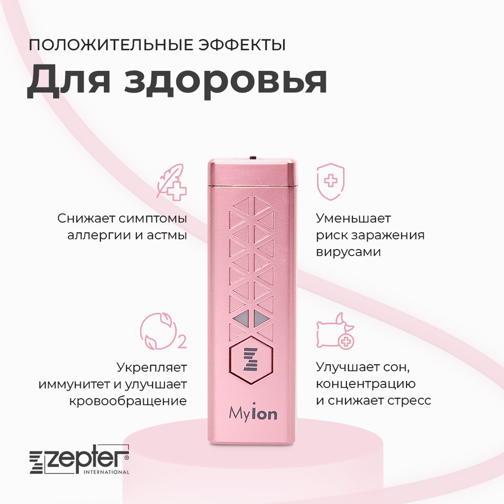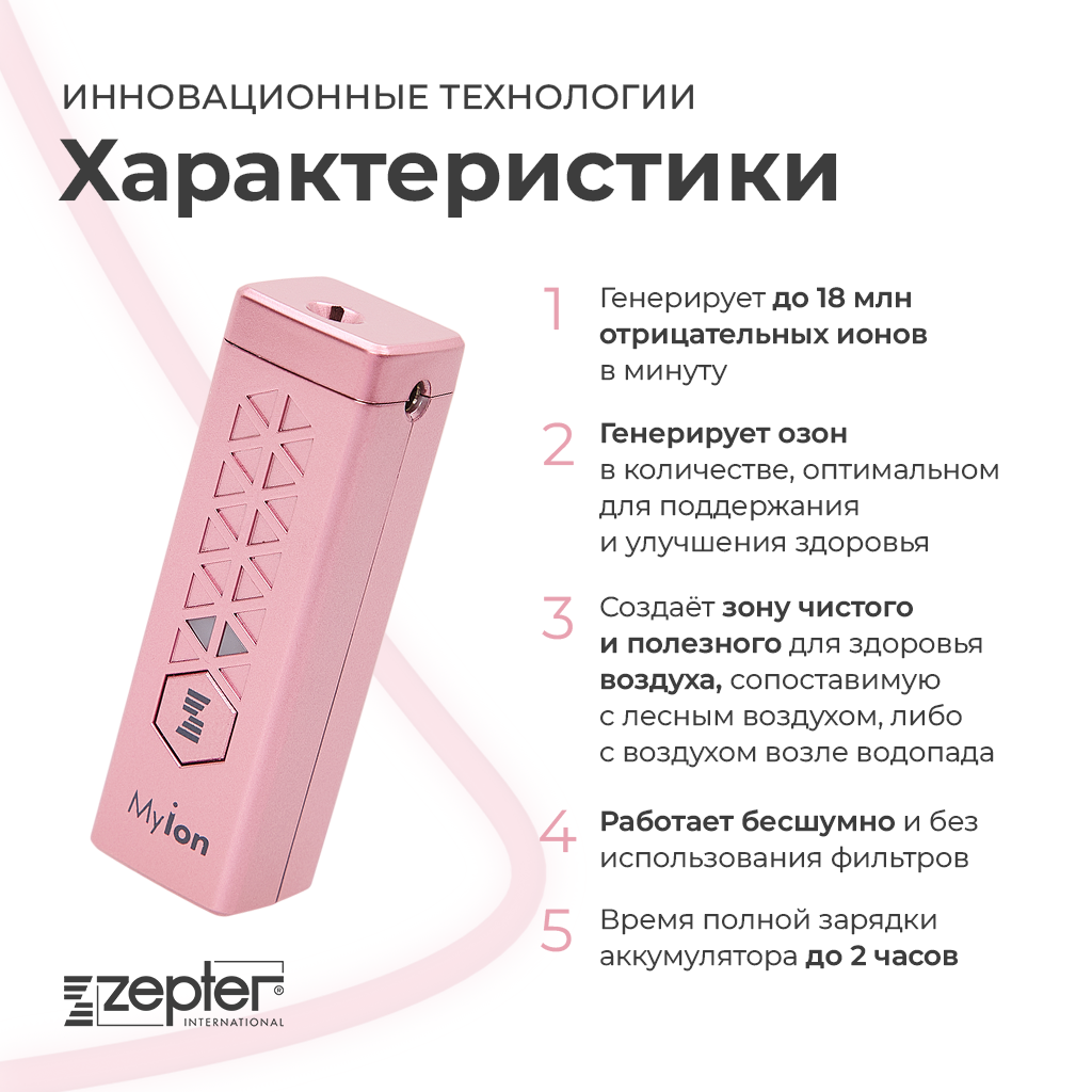 Myion от Цептер – инновационный персональный очиститель - стерилизатор воздуха, который устраняет все загрязнения в воздухе в радиусе 30 см от себя с помощью технологии ионизации. Устройство носится на шее как кулон и весит всего 25. Myion генерирует 18 000 000 отрицательных ионов на см3, что предотвращает попадание в дыхательную систему вредных частиц, таких как PM2.5, пыль, аллергены и вирусы. Отрицательно заряженные ионы захватывают находящиеся в воздухе частицы и утяжеляют их, вытесняя из вашего личного пространства.