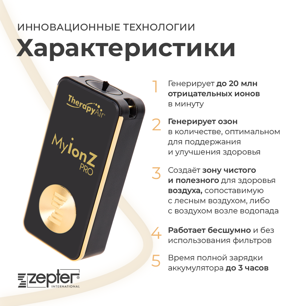 MyionZ Pro представляет собой персональный портативный очиститель - стерилизатор воздуха второго поколения. Очиститель воздуха использует передовую технологию ионизации воздуха для защиты от мельчайших микроскопических частиц, таких как бактерии, плесень и вирусы, которые, как правило, представляют наибольшую опасность для здоровья человека. Постоянная защита в течение дня обеспечивается непрерывным потоком полезных для здоровья отрицательных ионов, радиус действия около 50 см.
