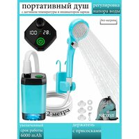 Кемпинговый мобильный летний душ легкий, компактный, поставляется в специальном кейсе для хранения. В комплект входит водопроводный шланг из ПВХ длиной 2 метра, крепление, насадка для душа и USB-кабель для зарядки. Переносной душ для кемпинга оснащен цифровым индикаторам мощности заряда, не требует установки или подключения, что делает его удобным и безопасным для использования на открытом воздухе. Оснащен системой шумоподавления и специальной конструкцией дна, которая обеспечивает устойчивость на неровных поверхностях. Встроенный аккумулятор емкостью 6000 мАч обеспечивает более двух с половиной часов непрерывной работы. Шланг на резьбе обеспечивает более плотное прилегание к корпусу. Можно заряжать через интерфейс USB, он имеет съемный корпус насоса со встроенным фильтром, который легко очищать. Используется: на период отключения горячей воды, на даче, в бане, на отдыхе, в кемпинге, для мытья домашних животных, в дороге, на охоте. Без нагрева воды.