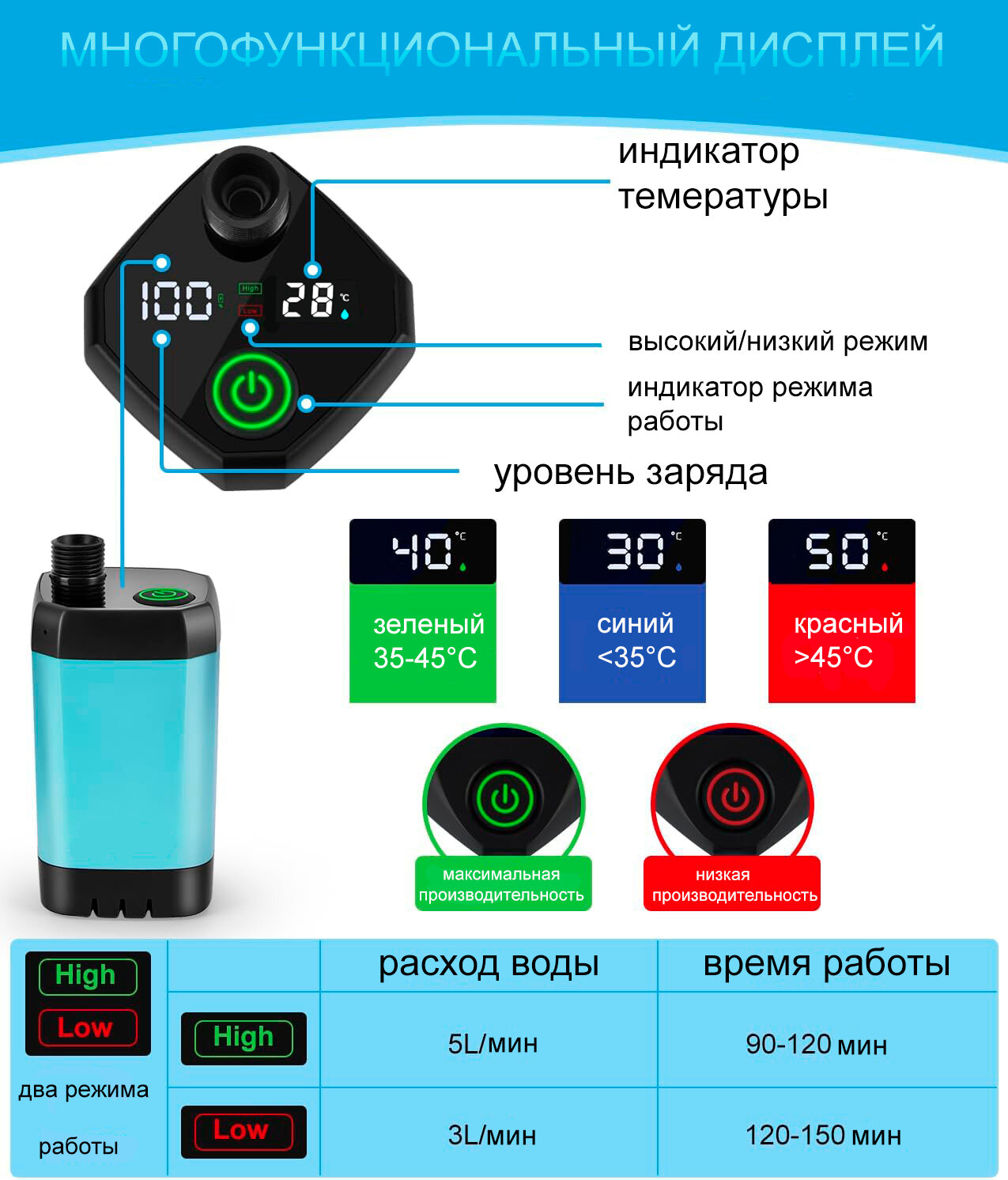 индикатор заряда, индикатор температуры, регулировка расхода воды, Для купания во время походов, в саду или при отсутствии горячей либо холодной воды., дальних поездок или мытья своего домашнего питомца, для походов, пикника или просто для использования на даче, рыбалки