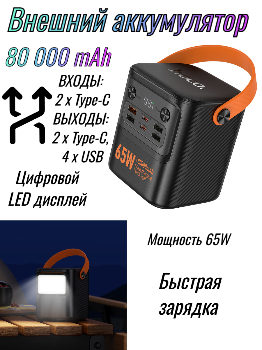 Мощный портативный внешний аккумулятор Power Bank Hoco J152 Pro способен заряжать до 6 устройств одновременно, благодаря 4 разъемам USB и 2 разъемам Type-C.