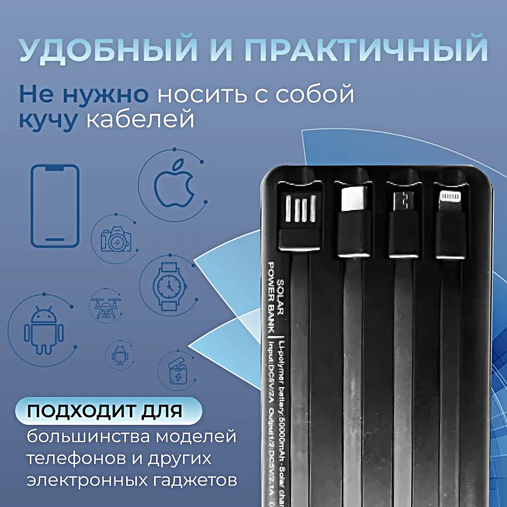 Купить Портативный внешний аккумулятор POWER BANK 50000 mAh, Солнечная панель, Фонарик, 4 встроенных кабеля для зарядки, Черный с доставкой по всей России.