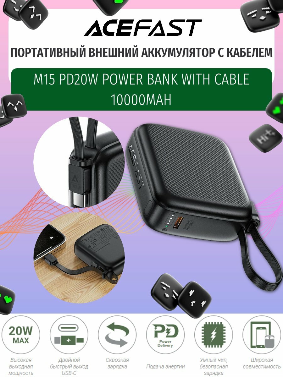 Портативный внешний аккумулятор с кабелем ACEFAST M15 PD20W Power Bank With Cable 10000Mah. Цвет: черный: сравнение цен, характеристики, фото, актуальное наличие и цены.