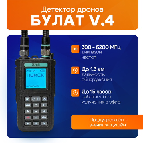Характеристики «Булат» версия 4 Расстояние обнаружения БПЛА: до 1.5 км; Время автономной работы от одного аккумулятора: до 6.5 часов; Тип и емкость аккумулятора: литиевый, 2300 мА*ч (17 020 мВт*ч); Разъемы для подключения антенн: SMA, 2 шт; Зарядный порт: DC 3.5 мм, USB Type-C; Разъем для подключения наушника: Jack 3.5 мм; Функциональная кнопочная клавиатура; Боковые кнопки управления: 3 шт; Диапазон рабочих температур: от -20°С до +45°С; Габариты: 120 х 60 х 34 мм; Вес: 300 г. Комплектация «Булат» версия 4 В стандартную комплектацию дрон-детектора входит: