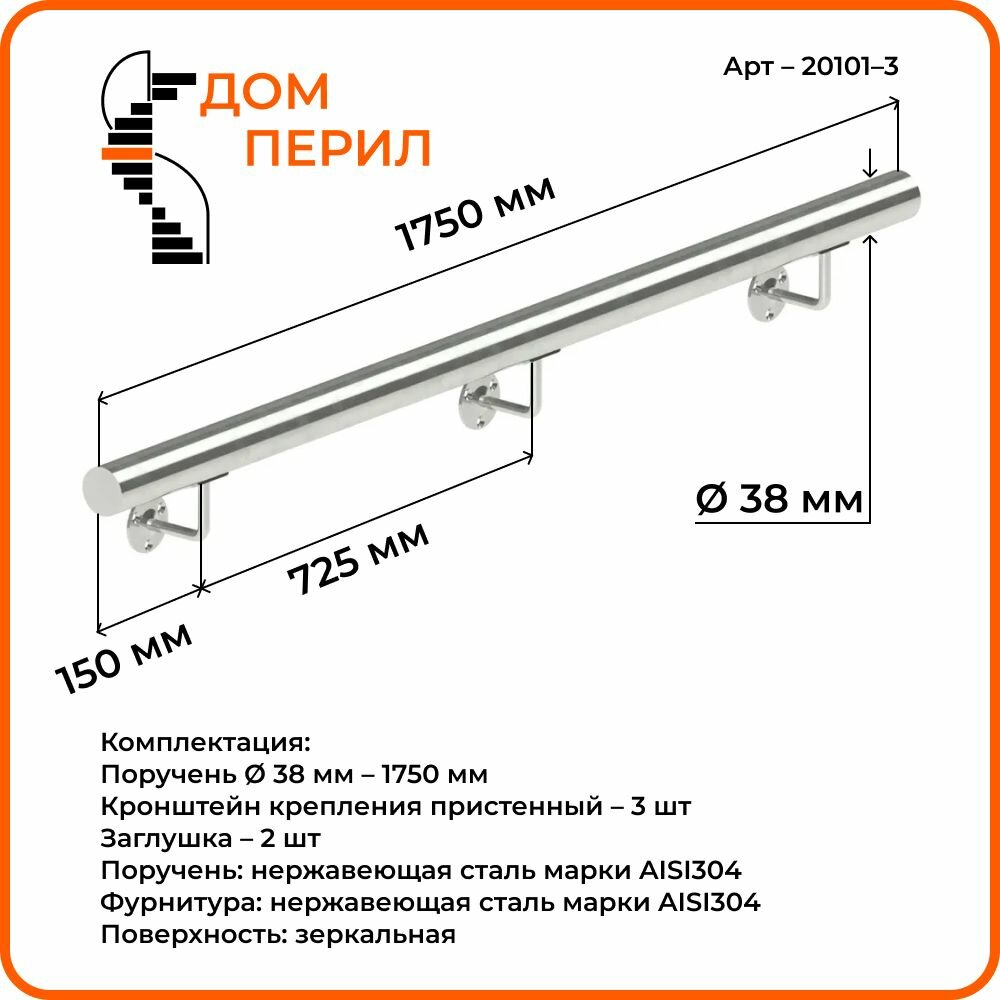 Комплект готового пристенного поручня из нержавеющей стали для установки на улице. Настенный поручень поставляется в собранном виде, требуется только закрепить на стене. Поручень служит опорой при перемещении по лестнице, обеспечивает защиту от падения, а так же имеет привлекательный современный дизайн. Комплектация: Поручень Ø 38 мм – 1750 мм. Кронштейн крепления пристенный – 3 шт. Заглушка – 2 шт. Важно! Саморезы, анкера, дюбеля в комплекте. Материал поручня: Нержавеющая сталь марки AISI304. Материал комплектующих: Нержавеющая сталь марки AISI304. Поверхность: Зеркальная. Поручень настенный из нержавеющей стали для самостоятельного монтажа - это готовый комплект пристенного поручня, который поставляется полностью в собранном виде. Пристенный поручень призван облегчить и обезопасить подъем и спуск по лестнице и проход прямых участков. Крепление монтируется на стену. Перила для лестницы убережет от скольжения и падения на скользком полу, а также при входе и выходе. Установка перил будет особенно актуальна для семей с детьми, пожилыми людьми и людьми с ограниченными возможностями, а также инвалидам. Его прочность при ежедневных нагрузках гарантирована качественными материалами. Поручни для лестницы служат опорой при перемещении, обеспечивают защиту от падения, а так же имеют привлекательный современный дизайн. Стандартный пристенный поручень способен на протяжении десятилетий сохранять привлекательный внешний вид. Процесс установки достаточно простой, не требует особых профессиональных навыков, наличия специальных инструментов, так как крепление для поручня к стене идет в комплекте. Нет необходимости в проведении сварочных работ, технология монтажа не предполагает использование сложных крепежных элементов.