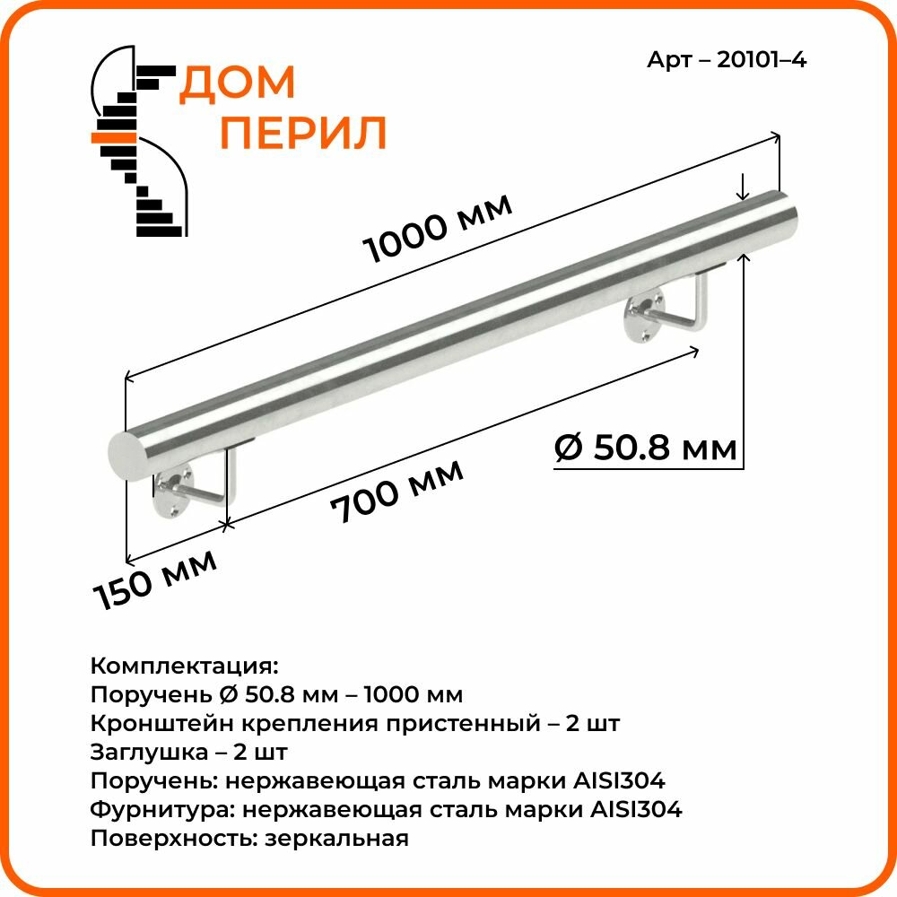 Комплект готового пристенного поручня из нержавеющей стали для установки на улице. Настенный поручень поставляется в собранном виде, требуется только закрепить на стене. Поручень служит опорой при перемещении по лестнице, обеспечивает защиту от падения, а так же имеет привлекательный современный дизайн. Комплектация: Поручень Ø 50,8 мм – 1000 мм. Кронштейн крепления пристенный – 2 шт. Заглушка – 2 шт. Важно! Саморезы, анкера, дюбеля в комплекте. Материал поручня: Нержавеющая сталь марки AISI304. Материал комплектующих: Нержавеющая сталь марки AISI304. Поверхность: Зеркальная. Поручень настенный из нержавеющей стали для самостоятельного монтажа - это готовый комплект пристенного поручня, который поставляется полностью в собранном виде. Пристенный поручень призван облегчить и обезопасить подъем и спуск по лестнице и проход прямых участков. Крепление монтируется на стену. Перила для лестницы убережет от скольжения и падения на скользком полу, а также при входе и выходе. Установка перил будет особенно актуальна для семей с детьми, пожилыми людьми и людьми с ограниченными возможностями, а также инвалидам. Его прочность при ежедневных нагрузках гарантирована качественными материалами. Поручни для лестницы служат опорой при перемещении, обеспечивают защиту от падения, а так же имеют привлекательный современный дизайн. Стандартный пристенный поручень способен на протяжении десятилетий сохранять привлекательный внешний вид. Процесс установки достаточно простой, не требует особых профессиональных навыков, наличия специальных инструментов, так как крепление для поручня к стене идет в комплекте. Нет необходимости в проведении сварочных работ, технология монтажа не предполагает использование сложных крепежных элементов.