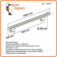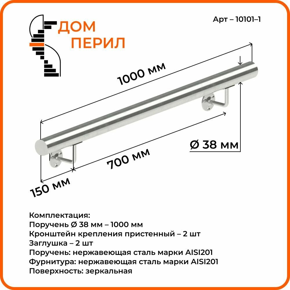 Комплект готового пристенного поручня из нержавеющей стали для установки внутри помещения. Настенный поручень поставляется в собранном виде, требуется только закрепить на стене. Поручень служит опорой при перемещении по лестнице, обеспечивает защиту от падения, а так же имеет привлекательный современный дизайн. Комплектация: Поручень Ø 38 мм – 1000 Кронштейн крепления пристенный – 2 шт. Заглушка – 2 шт. Материал поручня: Нержавеющая сталь марки AISI201. Материал комплектующих: Нержавеющая сталь марки AISI201. Поверхность: Зеркальная. Важно! Саморезы, анкера, дюбеля в комплекте. Поручень настенный из нержавеющей стали для самостоятельного монтажа - это готовый комплект пристенного поручня, который поставляется полностью в собранном виде. Пристенный поручень призван облегчить и обезопасить подъем и спуск по лестнице. Перила для лестницы убережет от скольжения и падения, отлично подходит в ванную комнату или санузел. Еще данный поручень можно установить при входе или выходе, обеспечив безопасный проход прямых участков на скользком полу. Установка перил будет особенно актуальна для семей с детьми, пожилыми людьми и людьми с ограниченными возможностями, а также инвалидам. Его прочность при ежедневных нагрузках гарантирована качественными материалами. Поручни для лестницы служат опорой при перемещении, обеспечивают защиту от падения, а так же имеют привлекательный современный дизайн. Стандартный пристенный поручень способен на протяжении десятилетий сохранять привлекательный внешний вид. Крепление монтируется на стену. Процесс установки достаточно простой, не требует особых профессиональных навыков, наличия специальных инструментов. Нет необходимости в проведении сварочных работ, технология монтажа не предполагает использование сложных крепежных элементов.