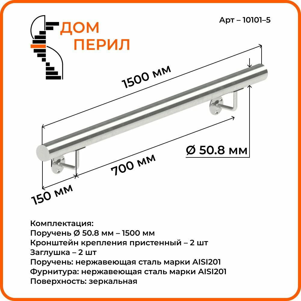 Комплект готового пристенного поручня из нержавеющей стали для установки внутри помещения. Настенный поручень поставляется в собранном виде, требуется только закрепить на стене. Поручень служит опорой при перемещении по лестнице, обеспечивает защиту от падения, а так же имеет привлекательный современный дизайн. Комплектация: Поручень Ø 50,8 мм – 1500 мм Кронштейн крепления пристенный – 2 шт. Заглушка – 2 шт. Материал поручня: Нержавеющая сталь марки AISI201. Материал комплектующих: Нержавеющая сталь марки AISI201. Поверхность: Зеркальная. Важно! Саморезы, анкера, дюбеля в комплекте. Поручень настенный из нержавеющей стали для самостоятельного монтажа - это готовый комплект пристенного поручня, который поставляется полностью в собранном виде. Пристенный поручень призван облегчить и обезопасить подъем и спуск по лестнице. Перила для лестницы убережет от скольжения и падения, отлично подходит в ванную комнату или санузел. Еще данный поручень можно установить при входе или выходе, обеспечив безопасный проход прямых участков на скользком полу. Установка перил будет особенно актуальна для семей с детьми, пожилыми людьми и людьми с ограниченными возможностями, а также инвалидам. Его прочность при ежедневных нагрузках гарантирована качественными материалами. Поручни для лестницы служат опорой при перемещении, обеспечивают защиту от падения, а так же имеют привлекательный современный дизайн. Стандартный пристенный поручень способен на протяжении десятилетий сохранять привлекательный внешний вид. Крепление монтируется на стену. Процесс установки достаточно простой, не требует особых профессиональных навыков, наличия специальных инструментов. Нет необходимости в проведении сварочных работ, технология монтажа не предполагает использование сложных крепежных элементов.