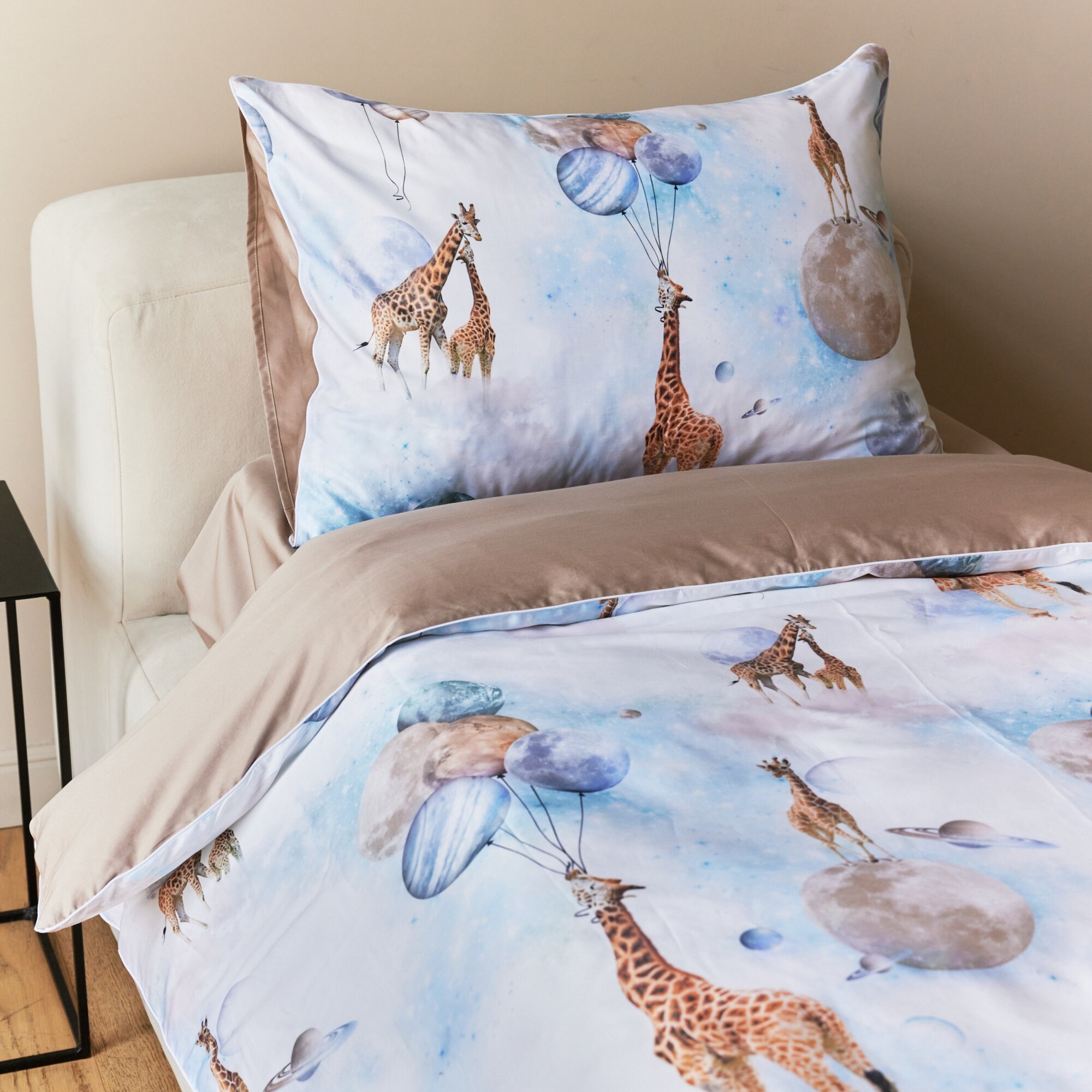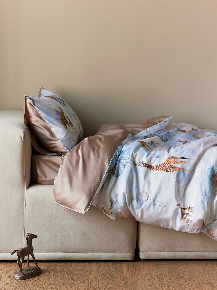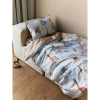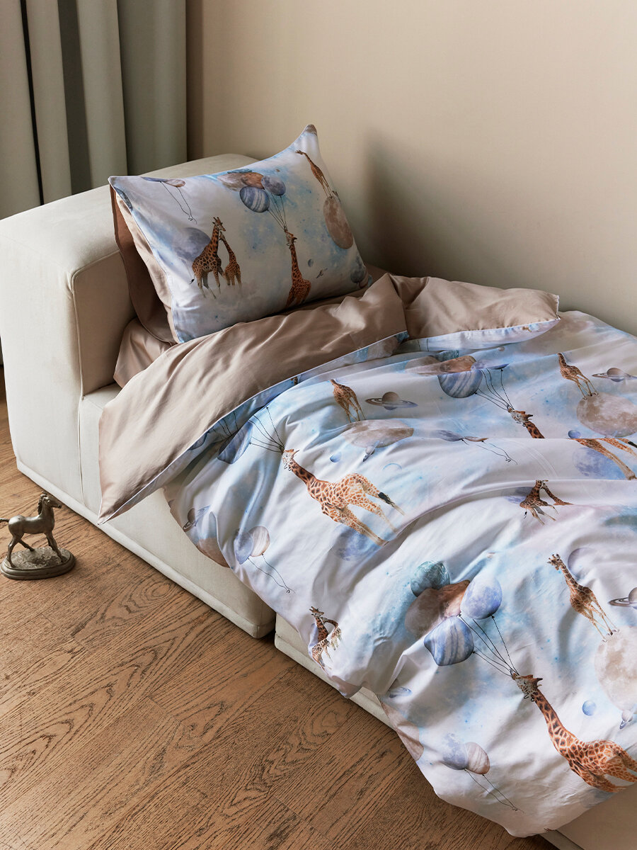 Мягкий и шелковистый материал обеспечивает отличную терморегуляцию, при этом не скользит, легко гладится. Комплект постельного белья включает в себя наволочку, пододеяльник на молнии, скрытой под клапаном, отделанных специальным кантом, а также простынь. Комплект идеально садится на одеяло, матрас и подушку. Особенностью комплекта является нежный принт «Жирафы в стране чудес», разработанный дизайнерами Lanima. Эстетичный кпб – полуторка в кроватку, российского производства - это вид постельных принадлежностей класса люкс, который не только станет частью домашнего декора, но и создаст особую атмосферу в квартире или на даче.