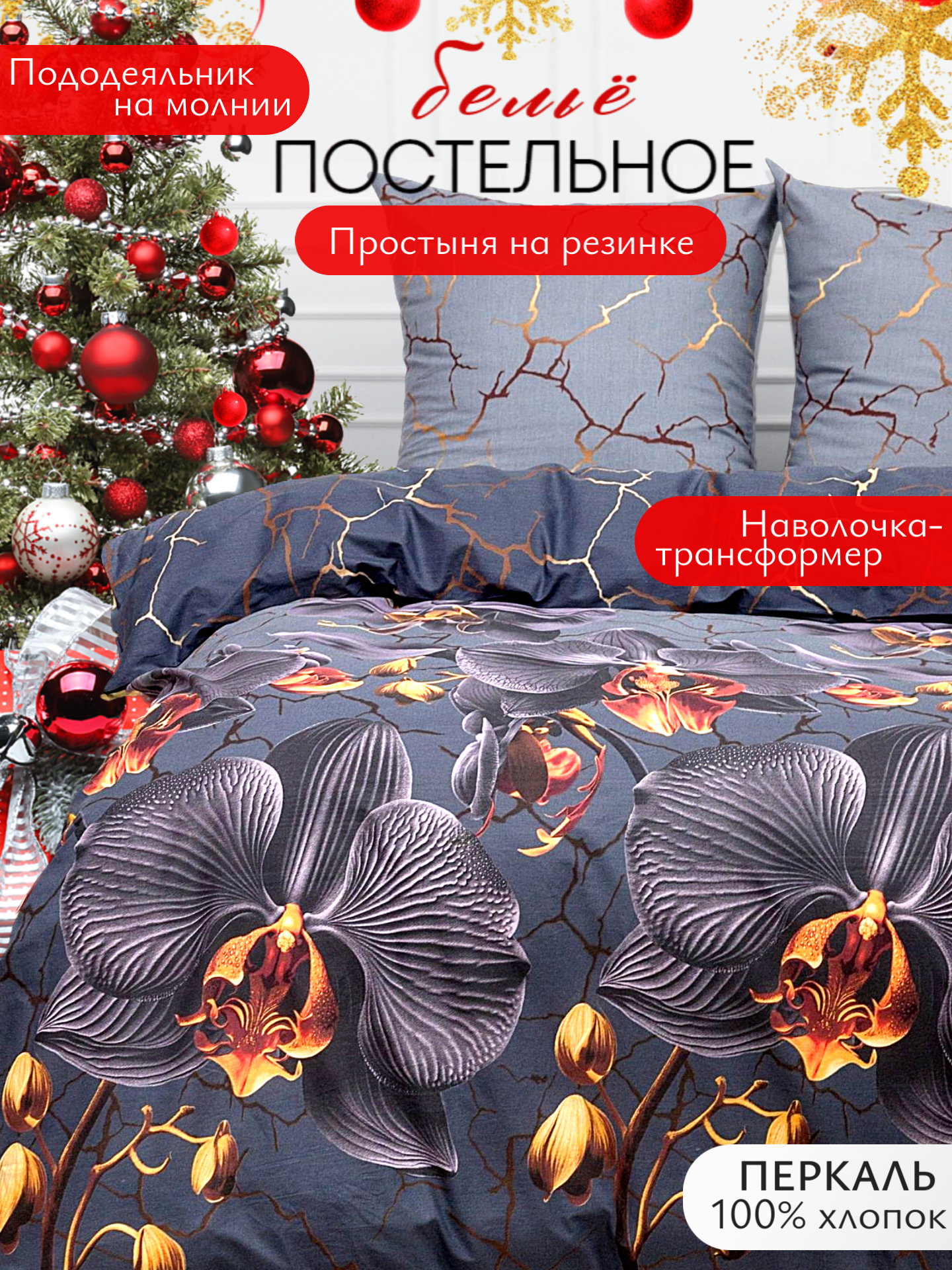 Купить Постельное белье евро Павлина Черная орхидея, перкаль хлопок 100%, простыня на резинке с доставкой по всей России.