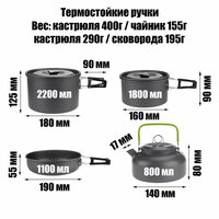 Вся посуда выполнена из высококачественных материалов (анодированного алюминия) обеспечивающих прочность и долговечность изделий. Все предметы имеют удобные термостойкие ручки для удобной транспортировки и использования.