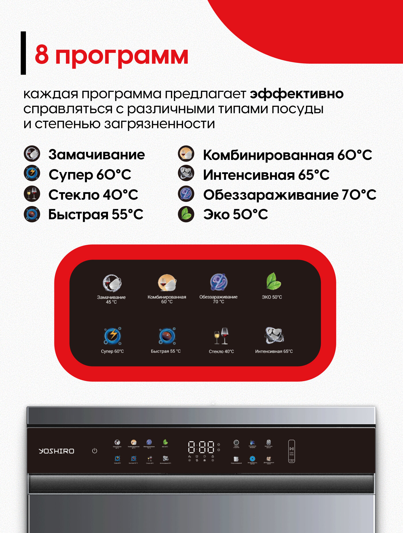 Купить Посудомоечная машина отдельностоящая 60 см YOSHIRO YDW-S60B3Y61, дополнительная сушка, половинная загрузка с доставкой по всей России.
