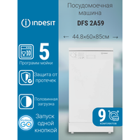 Посудомоечная машина отдельностоящая узкая Indesit DFS 2A59, белый, 45 см, 9 комплектов, 5 программ.