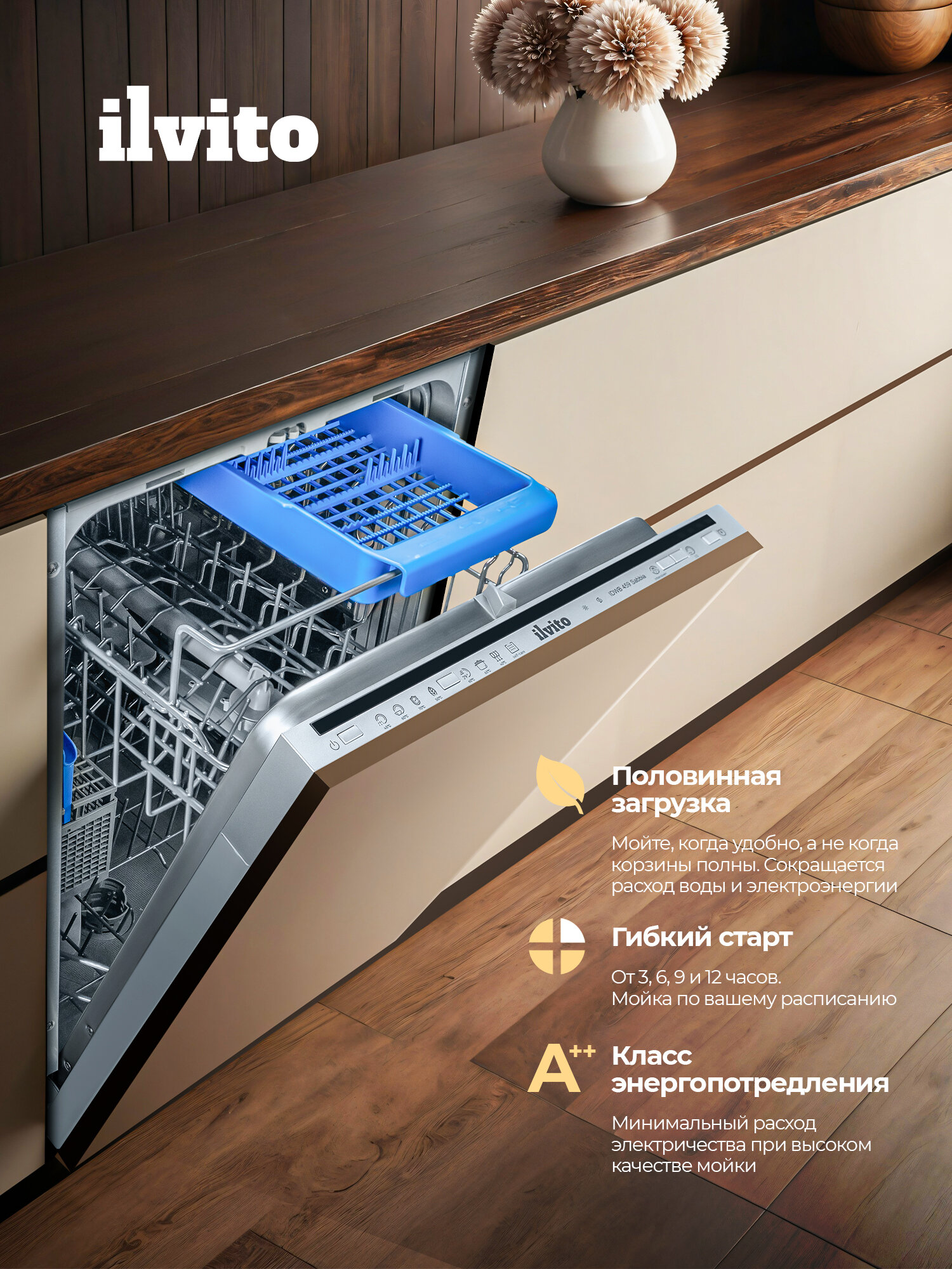 ILVITO IDWB 459 Sabbia — это продуманное решение для тех, кто ценит стиль, тишину и эффективность в каждой детали кухонной техники.