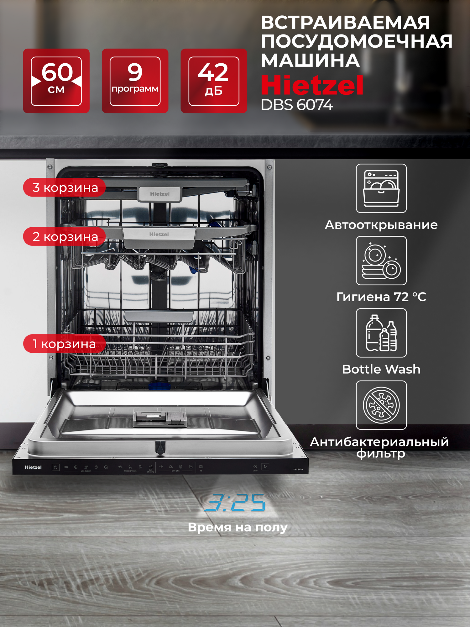 Посудомоечная машина встраиваемая 60 см Hietzel DBS 6074, луч в пол, Bottle Wash, Aqua Stop, 14 комплектов, автооткрывание дверцы: сравнение цен, характеристики, фото, актуальное наличие и цены.