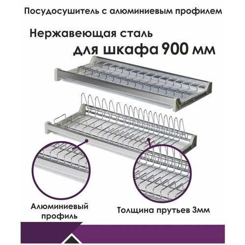 Посудосушитель из нержавеющей стали в модуль 900 мм с алюминиевой рамкой, 2 поддонами, - двухуровневая сушка для посуды премиум качества, предназначенная для хранения вымытых тарелок и кружек. Для каждого яруса предусмотрен собственный поддон, куда попадают капли воды в процессе сушки посуды. Толщина прутьев 3 мм. Посудосушитель предназначен для установки в мебельный модуль со стенками, изготовленными из ДСП толщиной 16 мм.