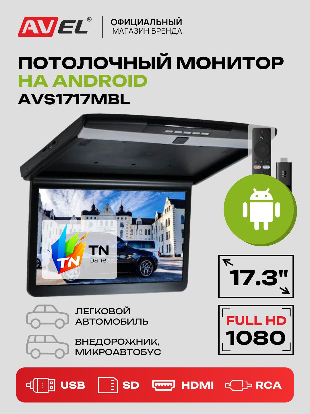 Потолочный монитор на Android для автомобиля AVEL AVS1717MBL, 17.3″, 1920 х 1080, чёрный: сравнение цен, характеристики, фото, актуальное наличие и цены.