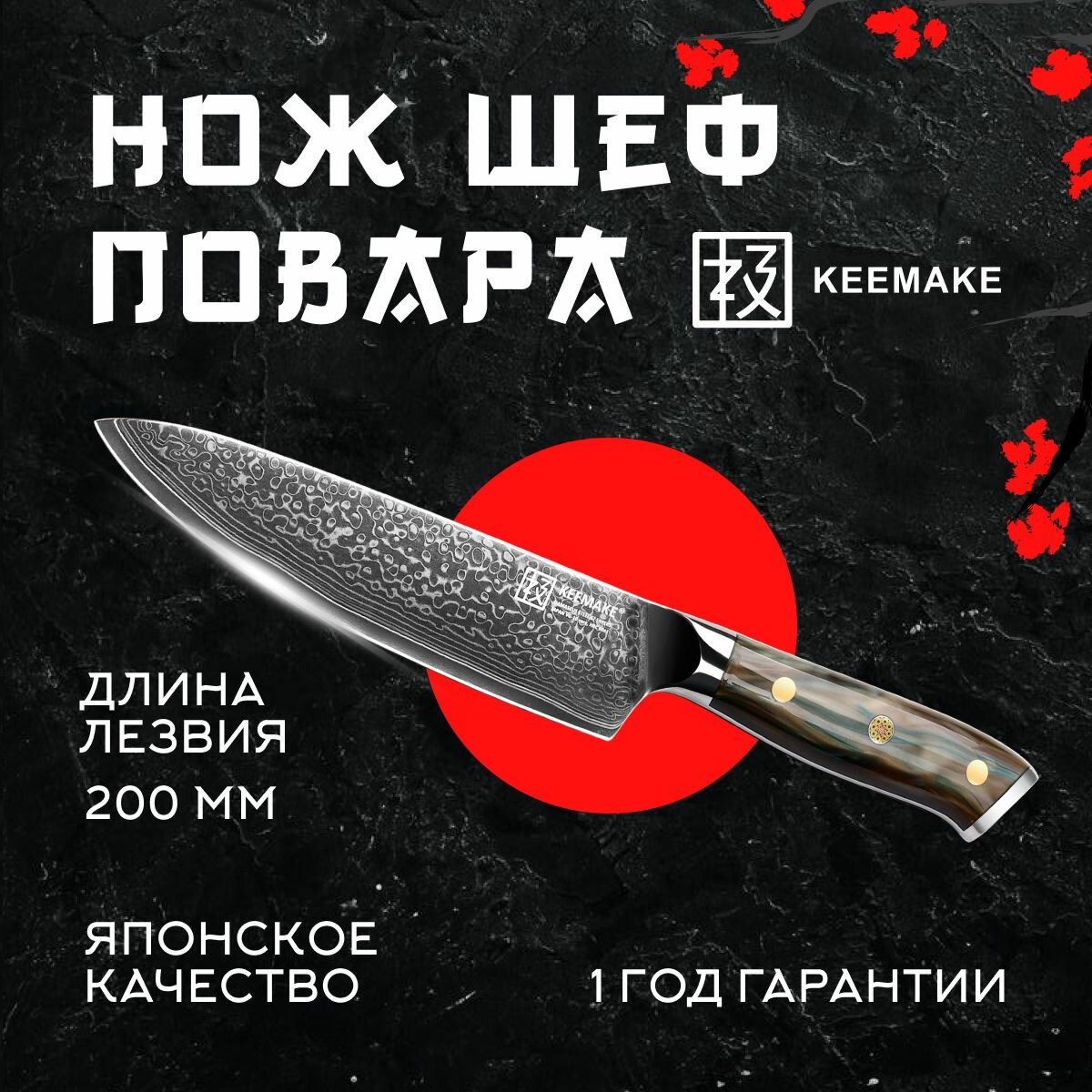 Шеф нож поварской CR-2 серии Green Gem от компании Keemake производится по древней дамасской технологии, сердечник изготовлен из высокоуглеродистой стали V Gold-10 с твердостью по Роквеллу 60 HRC. Шеф-нож этой серии оснащается больстером и навершием из нержавеющей стали для лучшего удобства и долговечности. Ножи кухонные от Keemake предназначены для множества кулинарных задач: это и быстрая нарезка овощей, и работа с зеленью, мясом и различными гастрономическими продуктами. Широкий клинок длиной 200 мм позволяет уверенно использовать этот нож из дамасской стали для резки лука, листового салата, тыквы, редьки, мяса и рыбы. Широкое лезвие и баланс веса делают кухонные ножи CR-2 удобными также и для использования в качестве лопатки для переноса нарезанных продуктов. Этот шеф ножи кухонные профессиональные занимают минимум места, несмотря на размеры. Эти кухонные принадлежности позволяют использовать любые технологии нарезки: от вертикальной шинковки до нарезки ломтиками и кубиками, жюльен или шифонад. Нож поварской профессиональный является идеальным выбором для мастеров своего дела и тех, кто ценит быструю и точную нарезку. Сердечник, который имеет шеф нож кухонный универсальный CR-2, изготовлен из стали VG-10, а поверх сердечника наложено 67 слоев дамасской стали с элементами кобальта и ванадия. Такое многослойное строение создает уникальный узор на боковых гранях клинка, благодаря чему ножи из дамасской стали выглядят эффектно. В процессе производства товары для кухни проходят вакуумную термообработку с отпуском после закалки, что улучшает твердость, вязкость и общие свойства клинка. Ножи для кухни от Keemake обладают сверхострым лезвием, заточенным симметрично на водных камнях высокой зернистости под небольшим углом с двух сторон. Ножи столовые от Keemake не требует частых заточек и обеспечивает идеальный рез на длительное время. Рукоять, которую имеет шеф нож поварской CR-2, получила овальное сечение, комфортно лежит в руке и обеспечивает полный контроль над ножом. Она выполнена из эпоксидной смолы, отполированной до зеркального блеска. Рисунок на рукояти напоминает водопад, что прекрасно сочетается с узором клинка из дамасской стали. Материал рукояти гипоаллергенен и очень устойчив к сколам, трещинам, интенсивному использованию. Нож для мяса и овощей легко чистится и сохраняет гладкую поверхность. Рукоять украшена мозаичным пином из чистой меди, благодаря чему необычные ножи Keemake получают стильный и эффектный вид. Полный хвостовик, который имеет нож для овощей и мяса, обеспечивает идеальную развесовку и контроль. Рукоять плавно переходит в стальной больстер, который защищает кухонный нож универсальный CR-2 от накопления бактерий и создает оптимальный баланс. Каждый нож столовый производства Keemake отличается изысканным дизайном, безупречным качеством и превосходными эксплуатационными характеристиками. Ножи этой компании становятся неотъемлемыми помощниками на кухне и радуют своей надежностью и удобством использования. Компания Keemake, объединяя таланты мастеров, инженеров и дизайнеров, предлагает уникальный приборы для кухни для приготовления разнообразных блюд. Специалисты компании обладают обширным опытом, благодаря которому создается действительно надёжная кухонная утварь. Общая информация: • Название: Шеф нож для шинковки • Брен