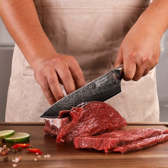 Профессиональный шеф ножи кухонные от Keemake P-4 из коллекции Phoenix — это настоящие шедевры, выполненные по традиционной дамасской технологии. Основа, которую получили кухонные ножи P-4, изготовлена из высокоуглеродистой стали V Gold-10, что придает ножам исключительную твердость, достигающую 60 единиц по шкале Роквелла. Дополнительно, ножи для кухни снабжены больстером и навершием из нержавеющей стали, что подчеркивает их прочность и надежность. Шеф нож поварской от Keemake предназначен для широкого спектра кулинарных задач: будь то быстрая и аккуратная шинковка овощей и зелени, работа с мясом или сырами, или любые другие гастрономические операции. Широкий клинок длиной 200 мм с острой кромкой, который отличает нож из дамасской стали P-4, идеально сбалансирован и делает процесс резки максимально удобным и эффективным. Эти кухонные принадлежности легко справляются не только с луком и салатными листьями, но также с такими сложными продуктами, как тыква, редька, мясо и рыба. Более того, благодаря широкому клинку, ножи кухонные профессиональные коллекции Phoenix можно использовать и как лопатку для переноса нарезки с разделочной доски на блюдо. Ножи из дамасской стали Keemake не требуют много места для работы. Эти товары для кухни позволяют использовать практически любые техники резки: вертикальная шинковка, нарезка ломтиками или кубиками, жюльен или шифонад – все это становится доступным и комфортным. Ножи столовые серии Phoenix от Keemake - идеальные инструменты для высококачественной и быстрой шинковки и нарезки. Уникальность, которую имеет шеф - нож кухонный профессиональный Keemake, заключается также в его многослойности. Сердечник из высокоуглеродистой стали VG-10 окован 67 слоями дамасской стали с добавлением кобальта, ванадия и других компонентов. Это делает шеф нож не только прочным и надежным, но и создает неповторимый узор на боковых гранях клинка, который выглядит очень эффектно и притягивает взгляд. В процессе создания нож для мяса и овощей Keemake проходит вакуумную термическую обработку с отпуском после закалки, что значительно улучшает твердость, вязкость и общие эксплуатационные характеристики. Лезвие, которое получил нож поварской Keemake P-4, обладает исключительной остротой: симметрично заточенное на водных камнях с высокой степенью зернистости, оно редко нуждается в дополнительной заточке и обеспечивает приборы для кухни идеально ровным и легким резом на протяжении длительного времени. Эргономичная рукоять овального сечения, изготовленная из натурального средиземноморского оливкового дерева, комфортно ложится в руку, обеспечивая нож для овощей и мяса полным контролем над процессом резки. Оливковое дерево – это очень прочный, влагонепроницаемый и стойкий к ударам материал. Естественная текстура дерева с ярко выраженными линиями не только красива, но и защищена природной маслянистой структурой. Цветовая гамма дерева плавно переходит от светлых тонов к более насыщенным, что гармонично сочетается с холодным глянцем дамасской стали, которую нож кухонный универсальный от Keemake использует в своей конструкции. Материал рукояти гипоаллергенный и очень твердый, что делает нож столовый серии Phoenix устойчивым к сколам, растрескиванию и интенсивному использованию. Рукоять легко чистится и сохраняет гладкость поверхности. Мозаичный пин из ч