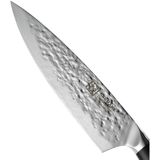 Шеф нож поварской T-1 из серии Twin компании Keemake представляет собой флагманскую модель в коллекции кованных ножей. Ножи кухонные производства Keemake созданы по старинной технологии дамасской стали, что делает кухонные принадлежности обладателями уникальных свойств и высокой прочности. Кухонные ножи T-1 имеют сердечник, выполненный из высокоуглеродистой стали V Gold-10, что обеспечивает ножи из дамасской стали твердостью по Роквеллу до 60 HRC. Дополнительные элементы, такие как больстер и навершие, изготовлены из нержавеющей стали, что придает стилю ножа завершённый вид и улучшает ножи для кухни в плане эксплуатационных качеств. Кухонный нож универсальный Keemake идеально подходит для быстрого и точного нарезания овощей, зелени, мяса и других продуктов. Эти товары для кухни имеют широкий клинок длиной 203 мм, снабженный сверхострой кромкой и идеально сбалансированным весом, что обеспечивает нож для мяса и овощей максимальным удобством и производительностью. Ножи кухонные профессиональные T-1 из серии Twin способны справиться с такими сложными задачами, как нарезка тыквы, редьки, мяса и рыбы, и могут также использоваться для перемещения нарезанных продуктов с разделочной доски в посуду. При всей своей внушительной длине и ширине, шеф нож из дамасской стали Keemake отличается компактностью. Он отлично подходит для использования любых техник нарезки, будь то вертикальная шинковка, нарезка ломтиками, кубиками, жюльен или шифонад. Нож поварской T-1 – это идеальный выбор для тех, кто ценит качество и скорость в кулинарии. Сердечник, который отличает шеф нож кухонный универсальный от Keemake, изготовлен из высокоуглеродистой стали VG-10 и окружен 67 слоями дамасской стали, содержащей кобальт, ванадий и другие элементы. Такая многослойность делает приборы для кухни обладателями уникального рисунка, который не только привлекательно выглядит, но и является признаком улучшенных свойств. В производстве нож универсальный серии Twin проходит термическую обработку в вакууме, что повышает его твёрдость и вязкость, улучшая общие эксплуатационные характеристики. Когда нож поварской профессиональный Keemake T-1 проходит процесс ковки, мастера производителя используют традиционную технику Цутимэ, что делает необычные ножи уникальными. Сверхострое лезвие, которое имеет шеф нож для овощей и мяса, заточено симметрично под минимальным углом на водных камнях высокой зернистости. Благодаря этому, кухонная утварь Keemake долго сохраняет остроту и готова к интенсивной работе, обеспечивая идеальный рез без частых заточек. Особенно стоит отметить эргономичную рукоять, которая завершает ножи столовые серии Twin. Она выполнена в овальном сечении, комфортно лежит в руке и позволяет полностью контролировать процесс резки. Материал рукояти – прочный, влагонепроницаемый и ударостойкий композит, который не только стильно дополняет клинок из дамасской стали, но и является гипоаллергенным и устойчивым к повреждениям. Рукоять легко очищается и сохраняет свою гладкую поверхность даже при активном использовании. Дизайн ножа дополнен мозаичным пином из чистой меди, что придает ему элегантность и заводскую изящность. Хвостовик ножа обеспечивает отличную развесовку и контроль, а стальной больстер, плавно переходящий в лезвие, создает оптимальный баланс и защищает стыки ножа от скопл