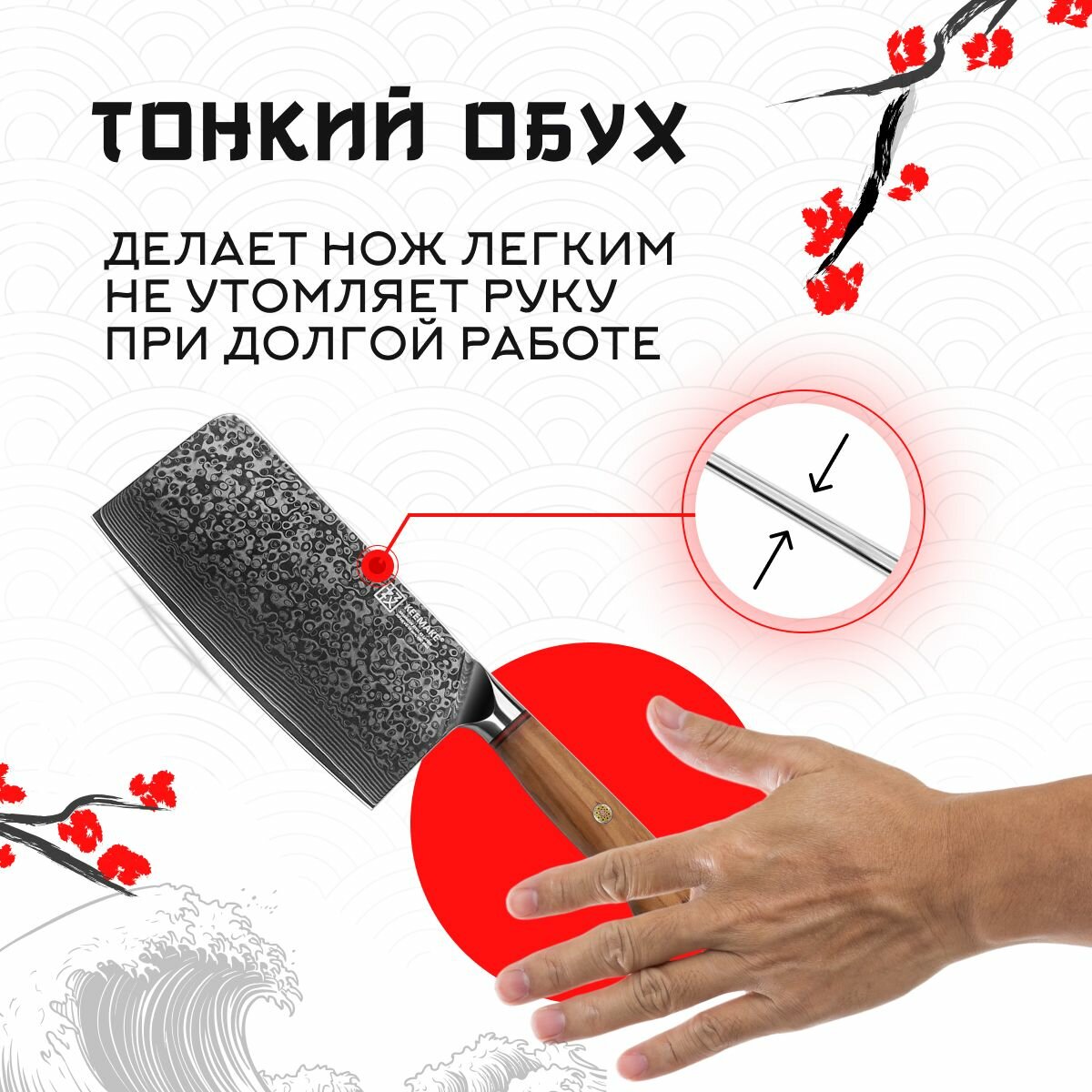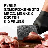 Тесак кухонный профессиональный P-1 марки Keemake был разработан специально для разделки различных видов мяса, птицу и рыбу. Ножи кухонные серии Phoenix обладают идеальными пропорциями и сбалансированным рабочим весом, что делает их чрезвычайно удобным для рубки замороженного мяса, а также для работы с мелкими костями и хрящами. Длина лезвия, которое получил нож тесак, составляет 171 мм, а его ширина — 87 мм. Эти параметры обеспечивают усиленный нож из дамасской стали отличным контролем над инструментом во время использования. Кроме того, кухонные принадлежности Keemake могут легко выполнять функции лопатки, позволяя вам быстро перекладывать нарезанные продукты с разделочной доски в посуду. Кухонные ножи для мяса Keemake относятся к премиальной и профессиональной серии инструментов под названием Phoenix. Товары для кухни изготовлены с использованием древней дамасской технологии, где центральная часть лезвия выполнена из высокоуглеродистой стали V Gold-10, что обеспечивает высочайшую твердость — 60 HRC по шкале Роквелла. Эта кухонная утварь подходит не только для разделки мяса, но и для профессиональной нарезки различных корнеплодов и зелени. Сердечник, который отличает ножи кухонные профессиональные серии Phoenix, изготовлен из стали VG-10, которая окружена 67 слоями дамасской стали с добавлением таких элементов, как кобальт и ванадий. Многослойная структура обеспечивает ножи из дамасской стали уникальными узорами на боковых гранях клинка, делая ножи для кухни не только эффективными, но и визуально привлекательными. В процессе производства нож для мяса Keemake проходит тщательную вакуумную термическую обработку с отпуском после закалки, что значительно улучшает его твердость, эластичность и общие эксплуатационные характеристики. Нож топор получил лезвие, которое обладает выдающейся остротой благодаря симметричной двойной заточке на водных камнях высокой зернистости под минимальным углом. Это позволяет инструменту сохранять свою остроту долгое время и работать с высокой точностью без необходимости частых заточек. Эргономичная рукоять овальной формы удобно ложится в руку, обеспечивая нож для разделки мяса полным контролем над процессом резки. Рукоять тесака Keemake из серии Phoenix выполнена из натурального средиземноморского оливкового дерева, которое отличает нож поварской P-1 высокой прочностью, влагозащитой и устойчивостью к механическим повреждениям. Богатая текстура дерева с выраженными линиями создаёт красивый визуальный эффект. Естественная маслянистая структура дерева обеспечивает нож для разделки рыбы и мяса дополнительной защитой материала. Градиент цвета, переходящий от светлого к более насыщенному оттенку, идеально гармонирует с глянцевым холодом дамасской стали клинка. Рукоять из оливкового дерева является гипоаллергенной и очень твердой, что делает нож разделочный серии Phoenix устойчивым к сколам, растрескиванию и интенсивному использованию. К тому же, рукоять легко чистится и сохраняет свою гладкую поверхность. Мозаичный пин из чистой меди украшает необычные ножи, придавая им утончённый и элегантный вид, соответствующий коллекции Phoenix. Нож для мяса разделочный от Keemake имеет полный хвостовик (фултанг), что обеспечивает идеальный баланс и контроль при использовании инструмента. Рукоять продолжается стальным больстером, к