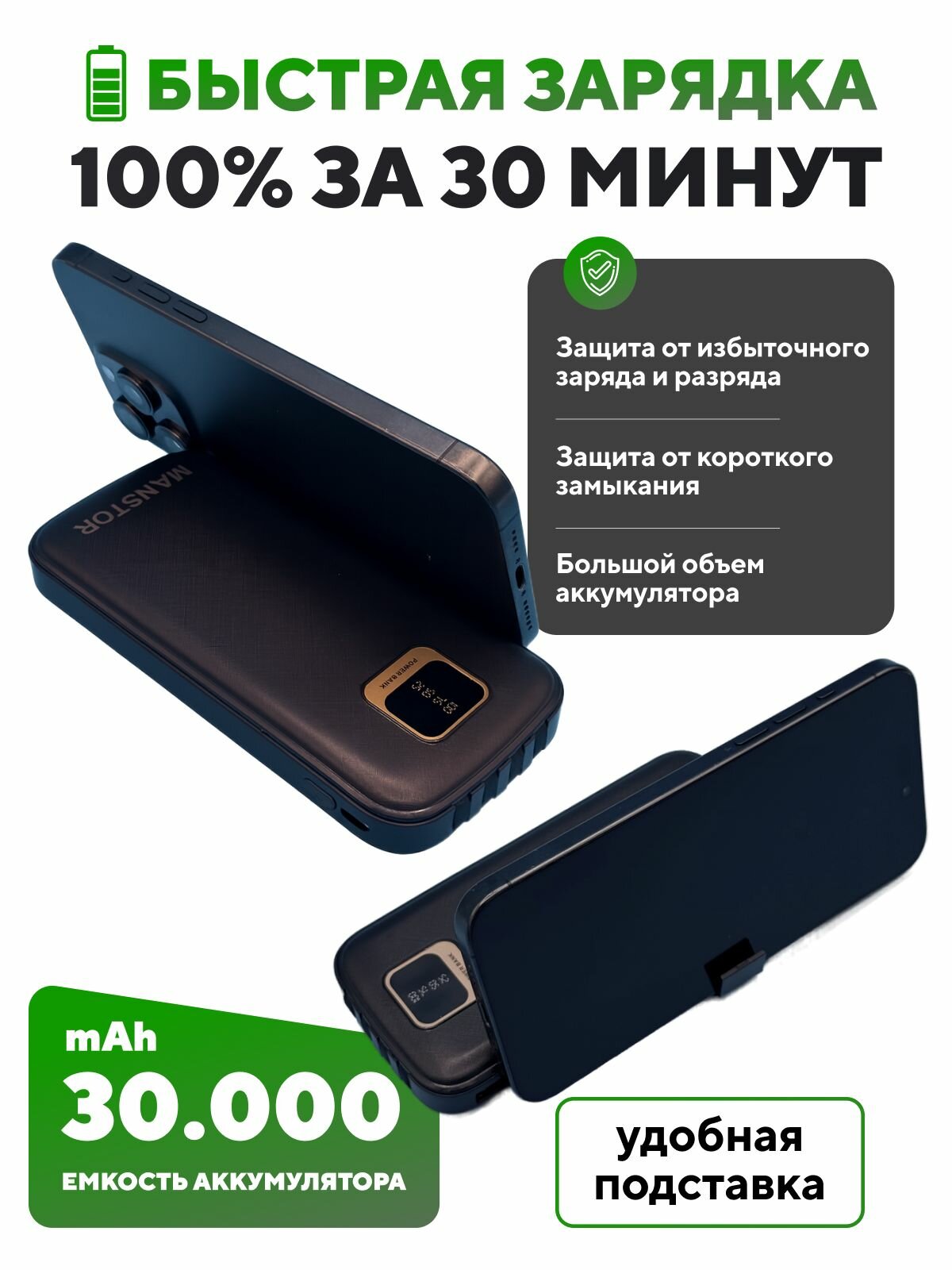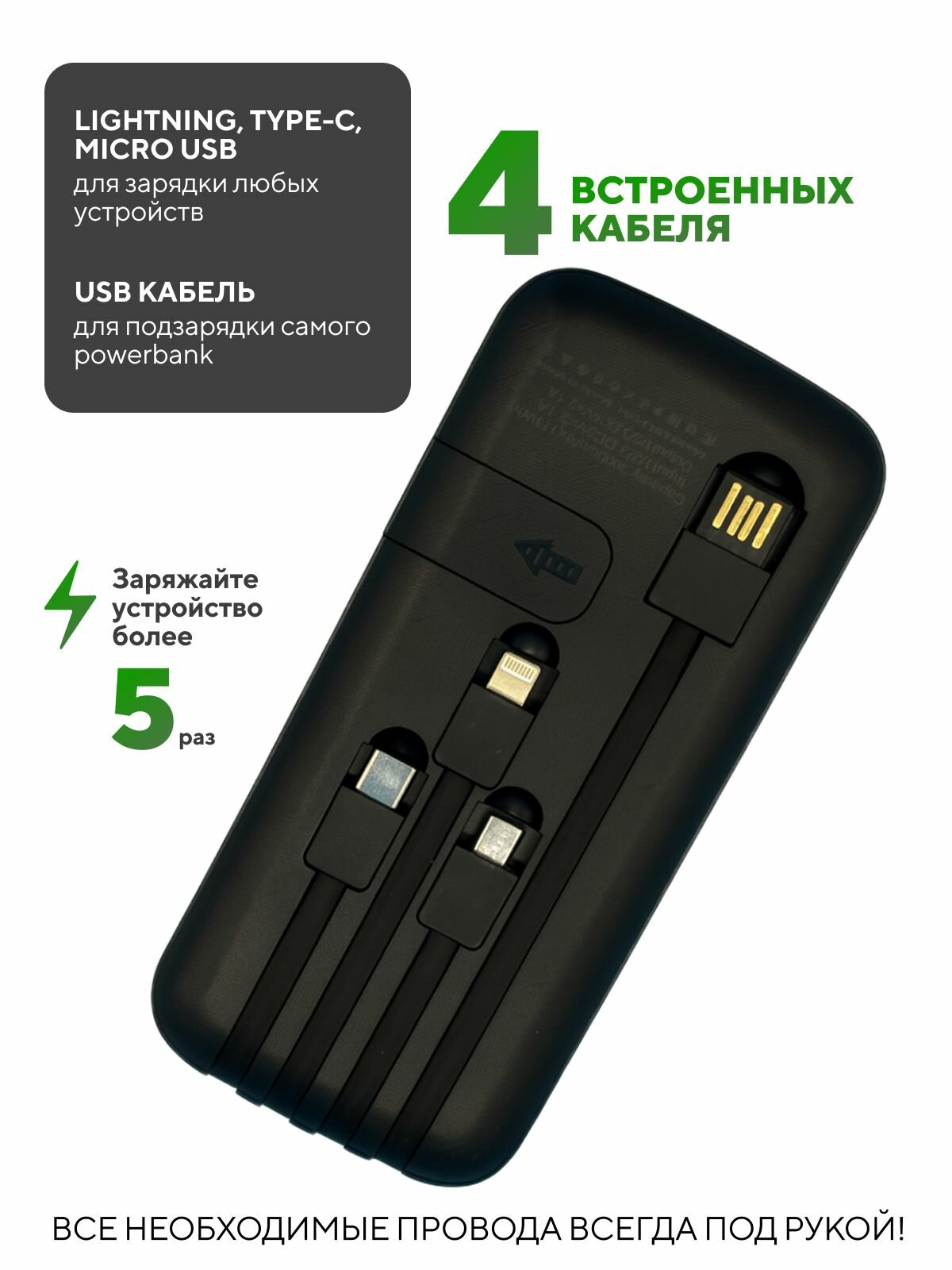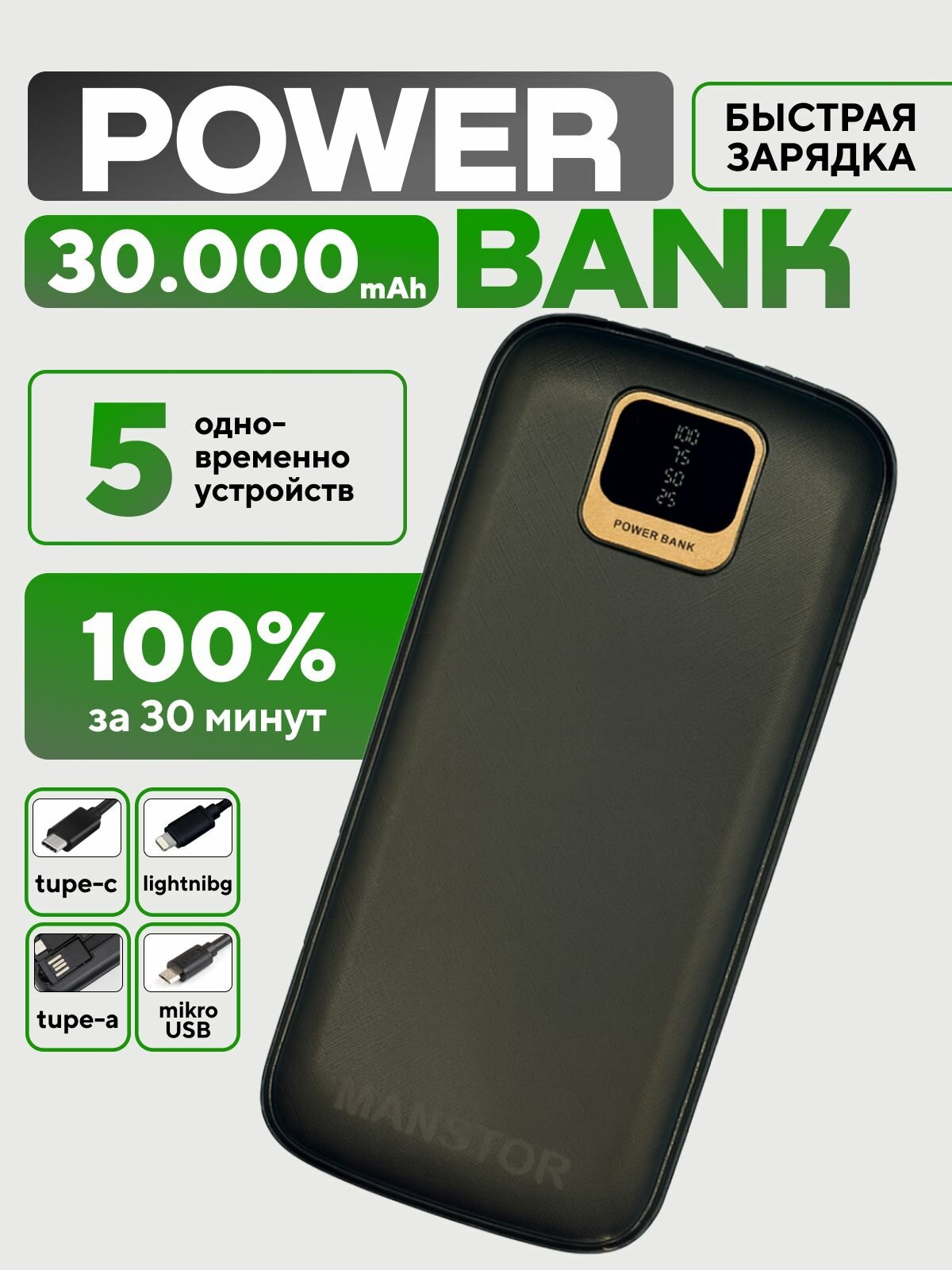 Купить Повербанк 30000MaH / внешний аккумулятор PowerBank c проводами Type-C и Lightning / пауэрбанк 30000 MaH с доставкой по всей России.