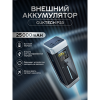Сuktech P23 создан как современное переосмысление классической модели QB826G, разработанного несколько лет назад той же командой. В сравнении с QB826G,- Максимальная выходная мощность на один порт увеличена на 16,6%, добавлена совместимость с протоколом PD3.1- Максимальная мощность, которая может быть использована для восполнения заряда самого P23 увеличилась на 116%, достигнув 110 Вт, что при использовании соответствующего зарядного устройства позволяет зарядить P23 c нуля до 40% всего за 19 минут.- Максимальная мощность на один порт, которую Cuktech P23 может использовать для зарядки, к примеру, ноутбука, увеличилась на 115%, достигнув 140 Вт- Улучшен встроенный дисплей: теперь больше по размеру и показывает не только уровень заряда самого Power bank, но и детали идущей зарядки подключенных к нему устройств.- Изменены форма и внешний вид, P23 смотрится еще более современно и стильно, а часть секций корпуса сделаны прозрачными Длина Cuktech P23 меньше, чем у смартфона, конструкция удобна для того, чтобы держать одной рукой Длина у Cuktech P23 159,9 мм. Она с длиной узкой банки кока-колы емкостью 330мл, длина которой 145,1 мм, и меньше, чем у iPhone Pro Max (160,7 мм). Вес P23 – 632г, что позволяет свободно держать его в одной руке. Его удобно брать с собой в путешествия и командировки. Цветной 1,54’’ TFT дисплей Встроенный в Cuktech P23 Цветной 1,54’’ TFT дисплей является сокровищем для продвинутых пользователей. Он показывает массу технических данных: уровень оставшегося в P23 заряда, оставшееся время до окончания зарядки, входную мощность, выходные ток, напряжение и мощность и прочие технические данные, обновляемые в реальном времени. Количество выводимых на дисплей P23 данных, по оценкам Сuktech, превосходит по важности и полноте выбранных Cuktech для сравнения именитых и более дорогих конкурентов. Очень быстрая зарядка за счет мощности в 140 Вт на один Type-C порт, поддержка протокола PD 3.1 Выходная мощность в 140 Вт идеальна для максимально быстрой зарядки яблочного бука про версии. Телефон яблочко про версии позволяет зарядку мощностью до 27 Вт, что позволяет при помощи Сuktech P23 зарядить данную модель с 0 до 55% за 30 минут МИшный смартфон 13 про зарядит полностью за 18 минут. Максимально быстрая зарядка современных смартфонов Xiaomi Cuktech P23 имеет поддержку протокола Mi Turbo Charge, что позволяет заряжать современные смартфоны Xiaomi максимально быстро. Вот несколько примеров максимальной выходной мощности для разных моделей: 120 Вт для МI 13 Pro 67 Вт для МI 13 120 Вт для МI MIX 4 90 Вт для МI13 Ultra 67 Вт для редмик K60 120 Вт для редмик K60 Pro 120 Вт для редмик Note 12 Pro+ Встроенный радиатор Для того, чтобы чрезмерный нагрев не мешал Cuktech P23 выдавать высокую мощность в течение продолжительного времени, Power bank оснащен встроенными радиаторами. Слежением за температурой важных точек внутри Cuktech P23 занимаются 5 NTC термодатчиков. Соответственно, пользователю не придется беспокоиться о данном вопросе. Превосходное качество встроенных элементов питания Cuktech P23 построен на пяти высококачественных литий-ионных элементах питания типа 21700. Эти же элементы применяются электромобилях Тесла Девять видов защиты для безопасного использования От перегрева От короткого замыкания От зависания От превышения входного напряжения От превышения входного тока От превышения выходного напряжения От превышения выходного тока Встроенная в элементы питания защита от превышения тока и о