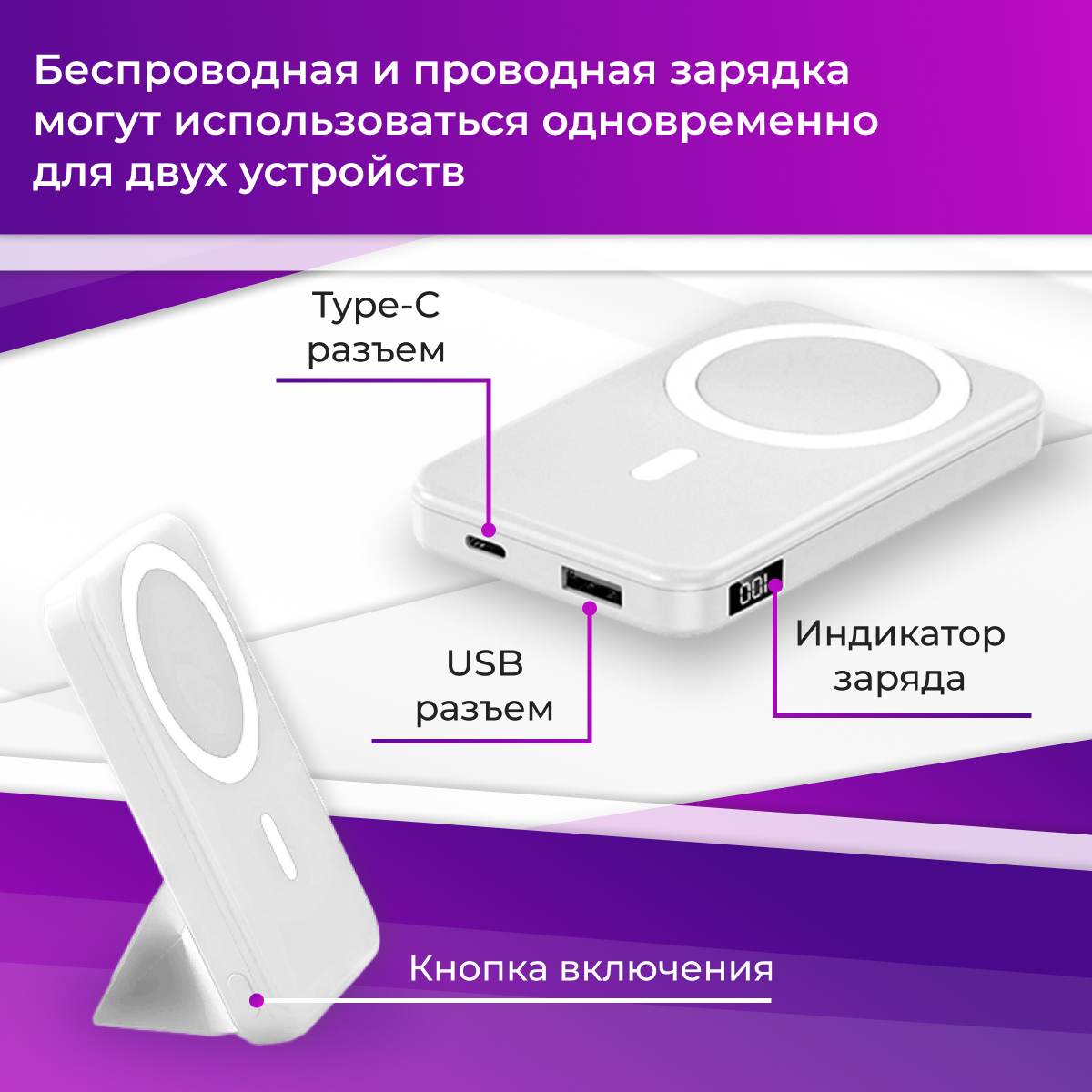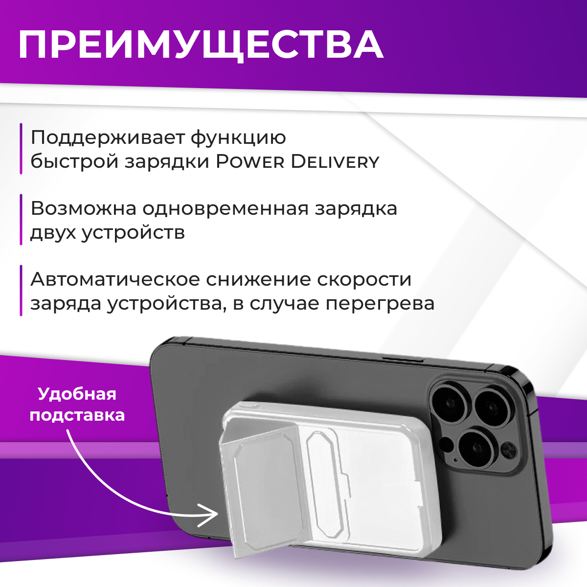 1. Магнитное крепление с поддержкой MagSafe — благодаря встроенной технологии, устройство легко и надежно крепится к вашему телефону, обеспечивая беспроводную зарядку без лишних проводов.