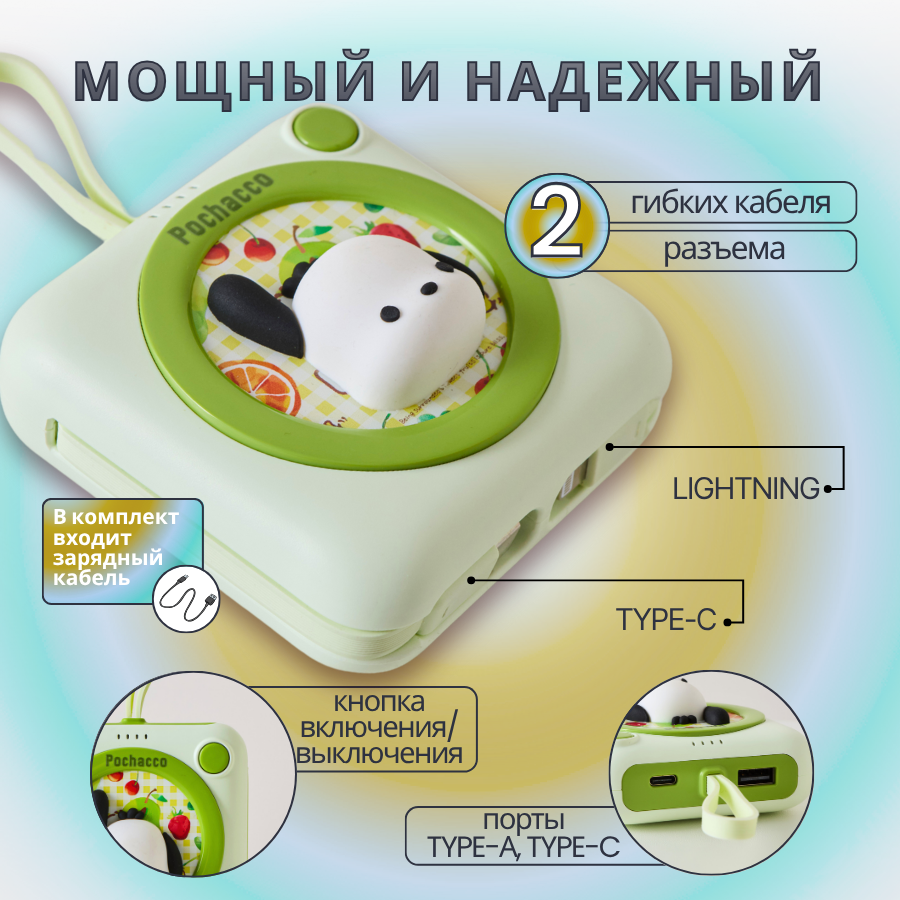 Наш мини повер банк для телефона - достаточно компактный и легкий, что делает его идеальным для походов и путешествий. Он легко помещается в карман или рюкзак, что делает его идеальным для путешествий. Мультяшный маленький герой на корпусе порадует девочек и мальчиков добавит ярких красок в повседневное использование. Hello Kitty, Cinnamoroll, Kuromi и Pochacco являются отличительной особенностью дизайна.
