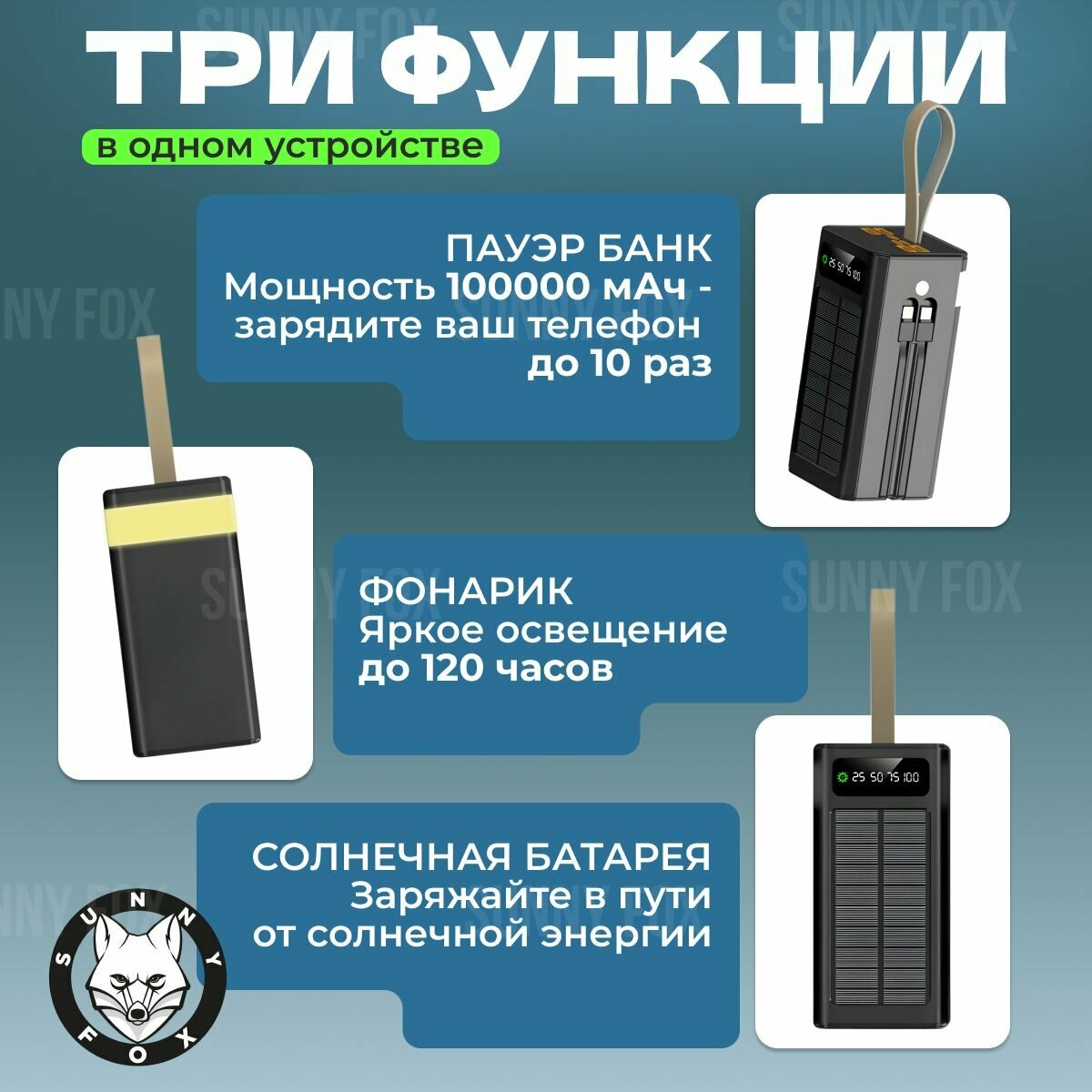 Откройте для себя максимальную автономность с повербанком Sunny Fox мощностью 100000 мАч, оснащенным функцией зарядки от солнечной батареи. Этот внешний аккумулятор идеально подходит для тех, кто ведет активный образ жизни, часто путешествует или нуждается в надежном источнике питания для различных устройств.