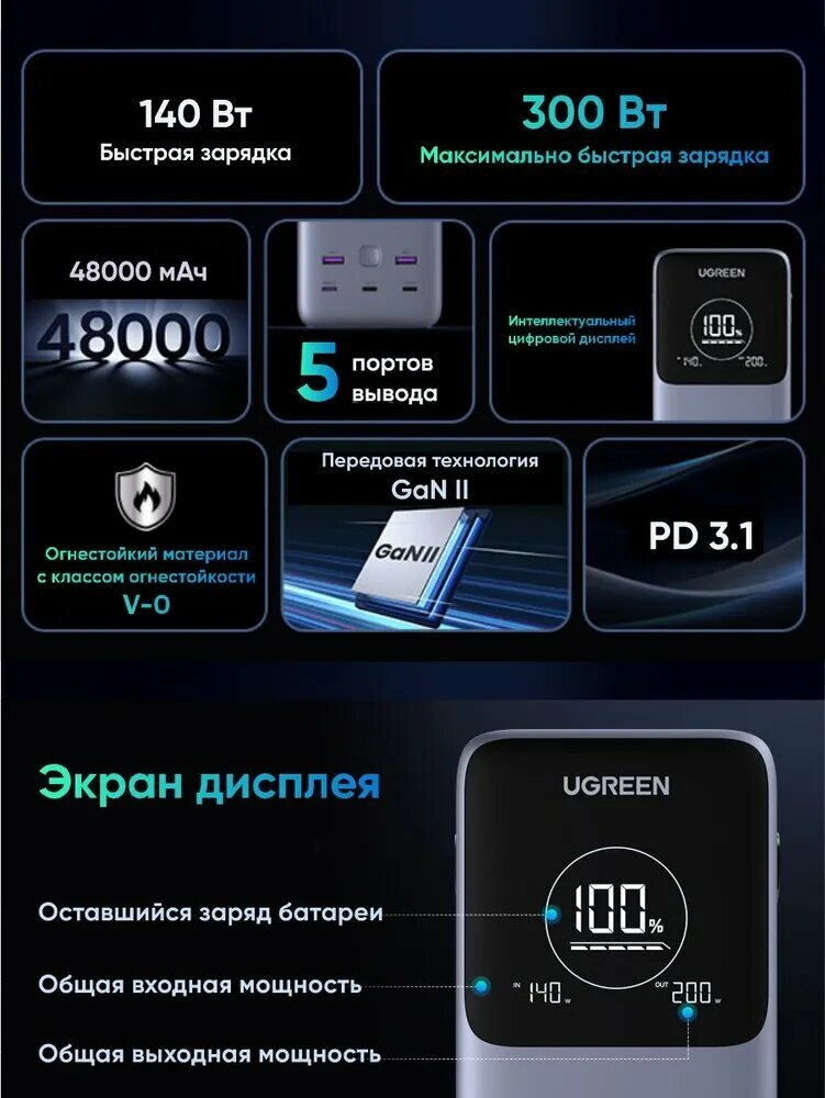 Купить Повербанк UGREEN PB770 (25286) 48000mAh 300W Fast Charging Powerbank. Цвет: серый с доставкой по всей России.