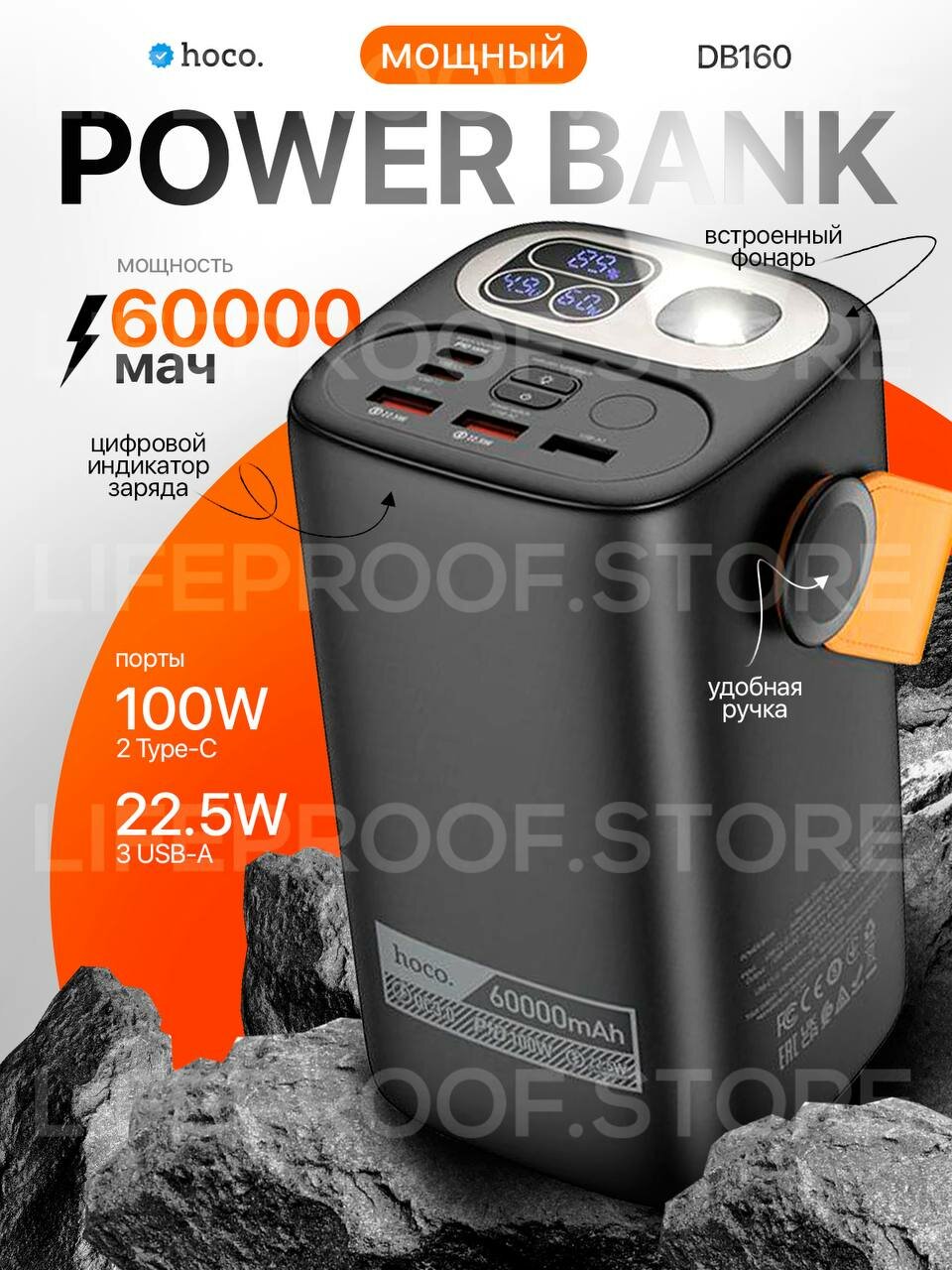 Повербанк / внешний аккумулятор Hoco DB160 60000mAh, 2хtype-C 100W, 3хUSB-A 22.5W, встроенный фонарь, цвет Черный: сравнение цен, характеристики, фото, актуальное наличие и цены.