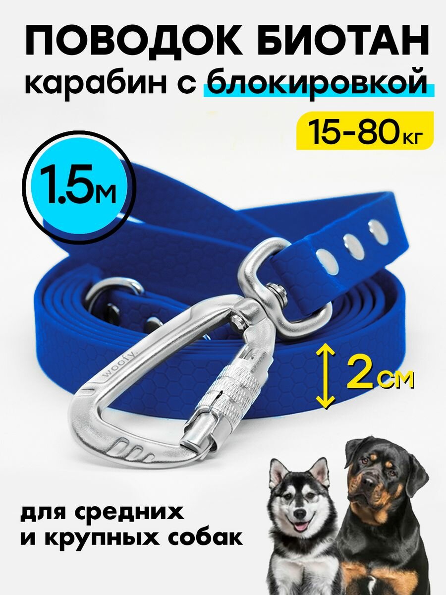 Преимущества поводков из биотана -- Не впитывает воду, грязь и запахи. -- Не дубеет на морозе и не выгорает на солнце. -- Обладает высокой прочностью, устойчив к износу. - -Не проскальзывает в руке и не обжигает, даже в мокрую погоду. -- Легко моется просто водой, сохнет 1-2 мин. --Карабин позволяет быстро снимать и надевать поводок.