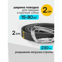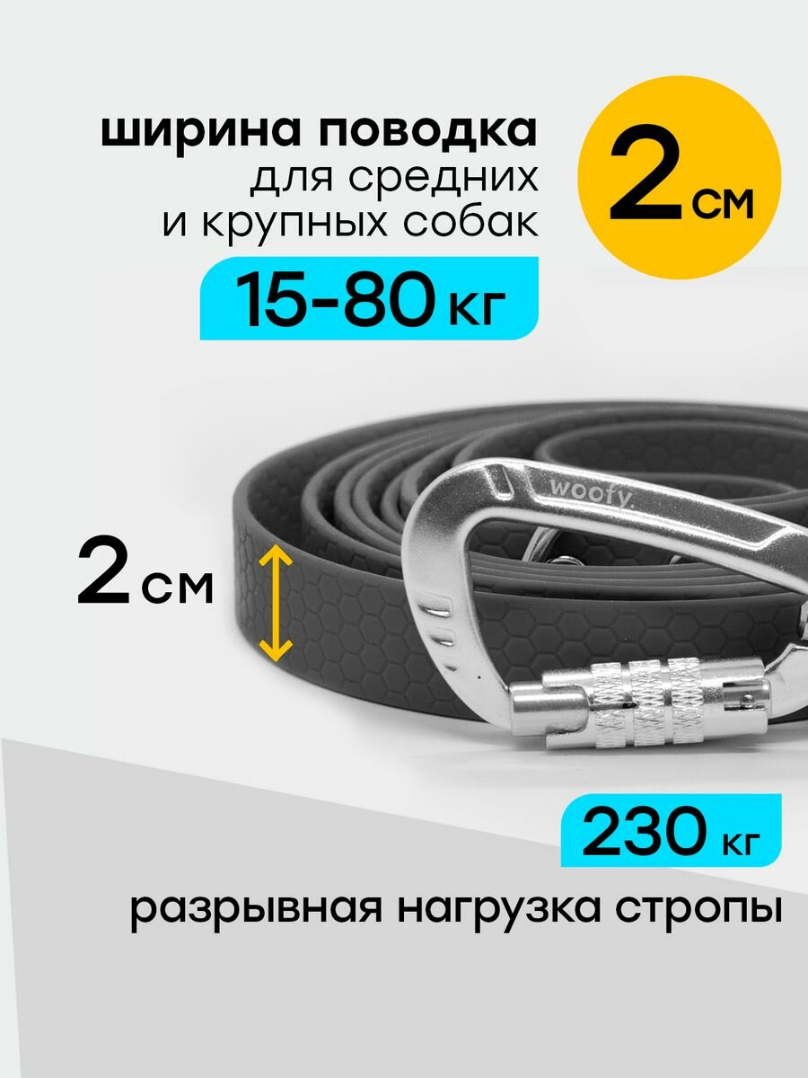--Легкий, но прочный биотановый поводок обладает приятной на ощупь текстурой, препятствующей скольжению в руке. --Поводок снабжен прочным усиленным карабином, с автоматической блокировкой, карабин вращается на 360 градусов, и не позволяет закручиваться поводку при движении. --Карабин выдерживает большие нагрузки, до 400 кг и резкие рывки даже крупных собак. --У поводка удобная и мягкая ручка петля, длиной 15 см, внизу которой расположено кольцо для крепления холдера (контейнера) для пакетов для уборки за собакой. --Водонепроницаемая прорезиненная стропа с внутренним армирующим слоем выдерживает нагрузку до 230 кг.