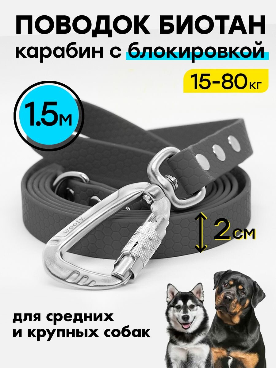 Преимущества поводков из биотана -- Не впитывает воду, грязь и запахи. -- Не дубеет на морозе и не выгорает на солнце. -- Обладает высокой прочностью, устойчив к износу. - -Не проскальзывает в руке и не обжигает, даже в мокрую погоду. -- Легко моется просто водой, сохнет 1-2 мин. --Карабин позволяет быстро снимать и надевать поводок.